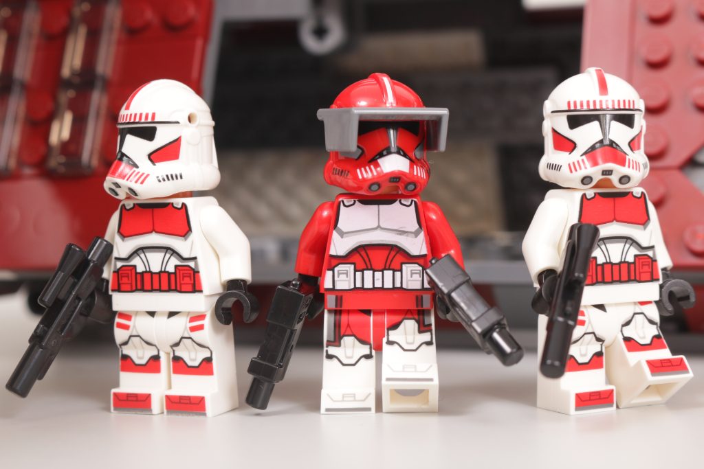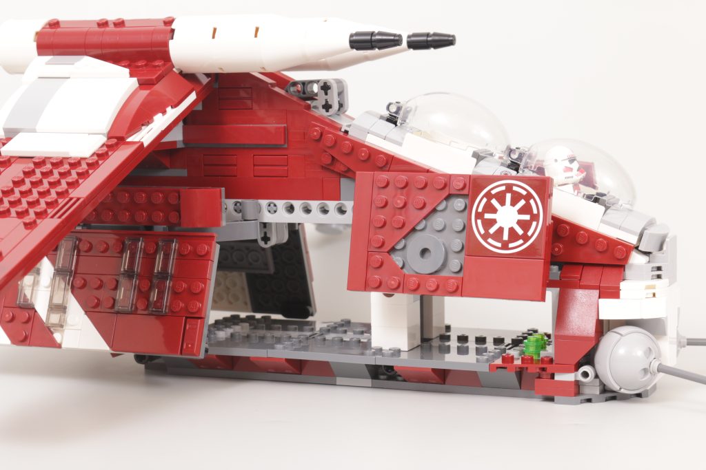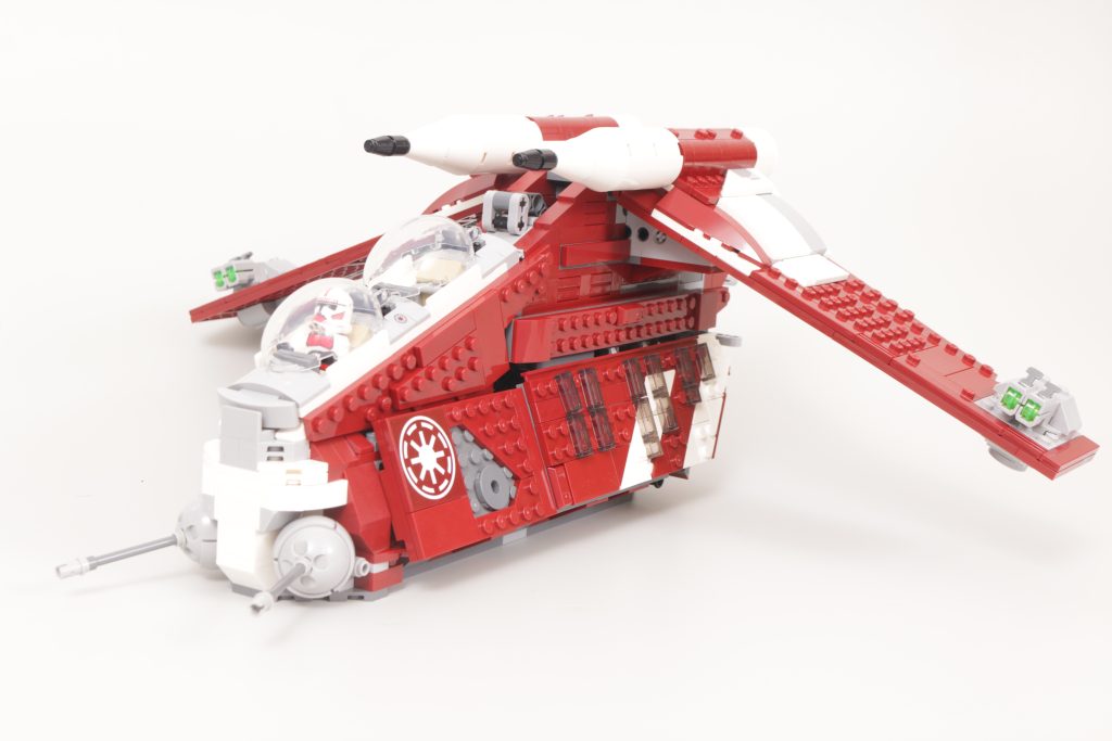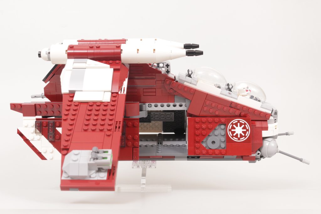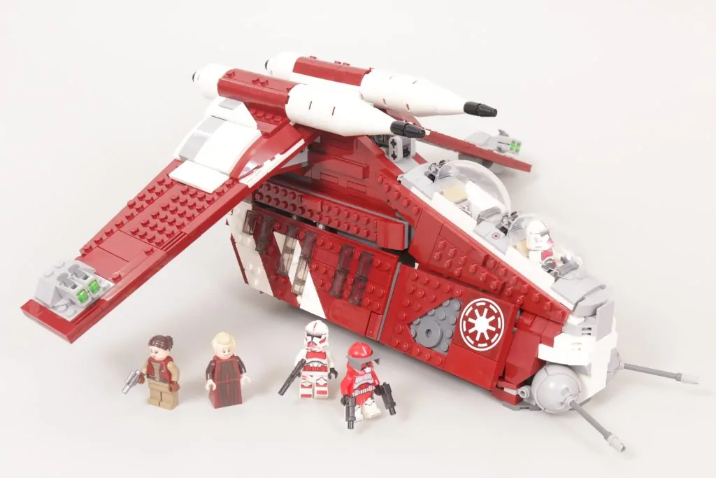 LEGO Star Wars team er ingenting om ikke variert i deres tilnærming gjennom årene til Gunship. Mens vi har gitt ut fire utgaver i minifigurskala i løpet av temaets historie, 75354 Coruscant Guard Gunship er bare den andre som bygger en versjon av Gunship med helt lukkende sidedører, etter 2008s Republic Attack Gunship, og den første som våget seg bort fra republikkens hvite, røde og grønne farger, til den mørkerøde og hvite Coruscant Guard-designen, som per opptreden i Crisis at the Heart - episode syv av sesong seks av The Clone Wars.
