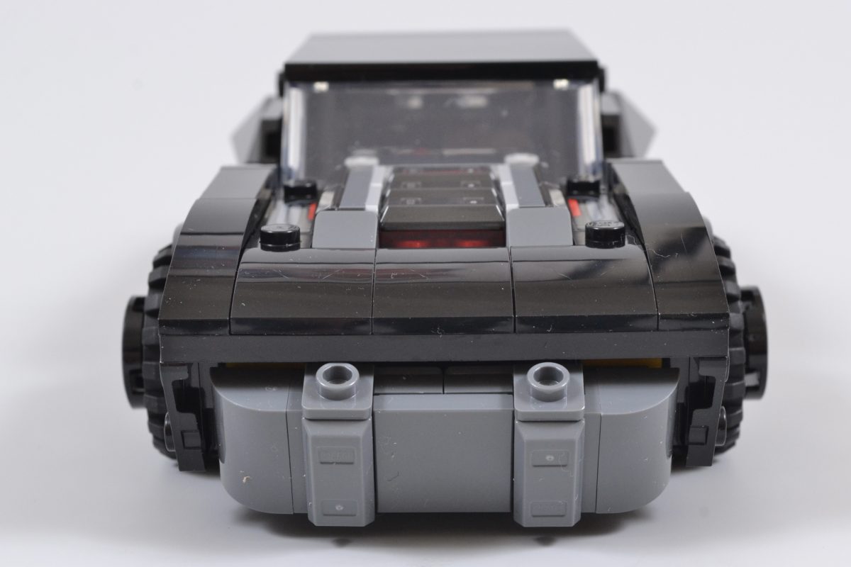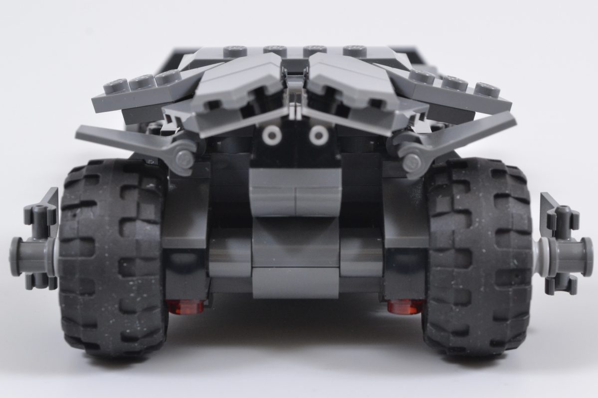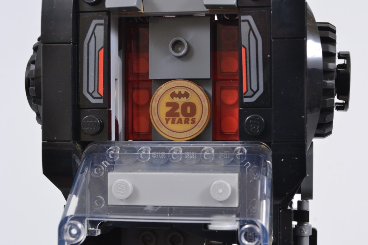 Disse forbedringene fortsetter med Batmobilens svakt buede panser (som er avtakbar og dekker over enda en perlegull LEGO-figur). Batman 20-årsjubileumsmynt), oppgradert synlig frontmotordel med transparentrøde deler, skråstilt grill, et lengre cockpitområde, mer imponerende finner, tilleggsdetaljer lagt til bilens kraftige bakmotor og klistremerker på hjulkapsler.