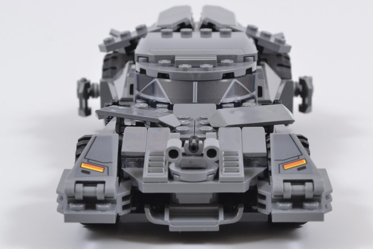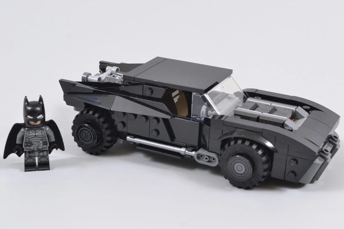 I stedet for en familievennlig vri på kjøretøyet, 76332 The Batman Batmobile dropper i stedet det forrige LEGO DC-settets to fjærbelastede skytevåpen og gjennomsiktige lyseblå eksoselementer, og velger i stedet å bruke hver av de 330 delene sparsomt for å oppnå det ønskede utseendet til den truende bilen.