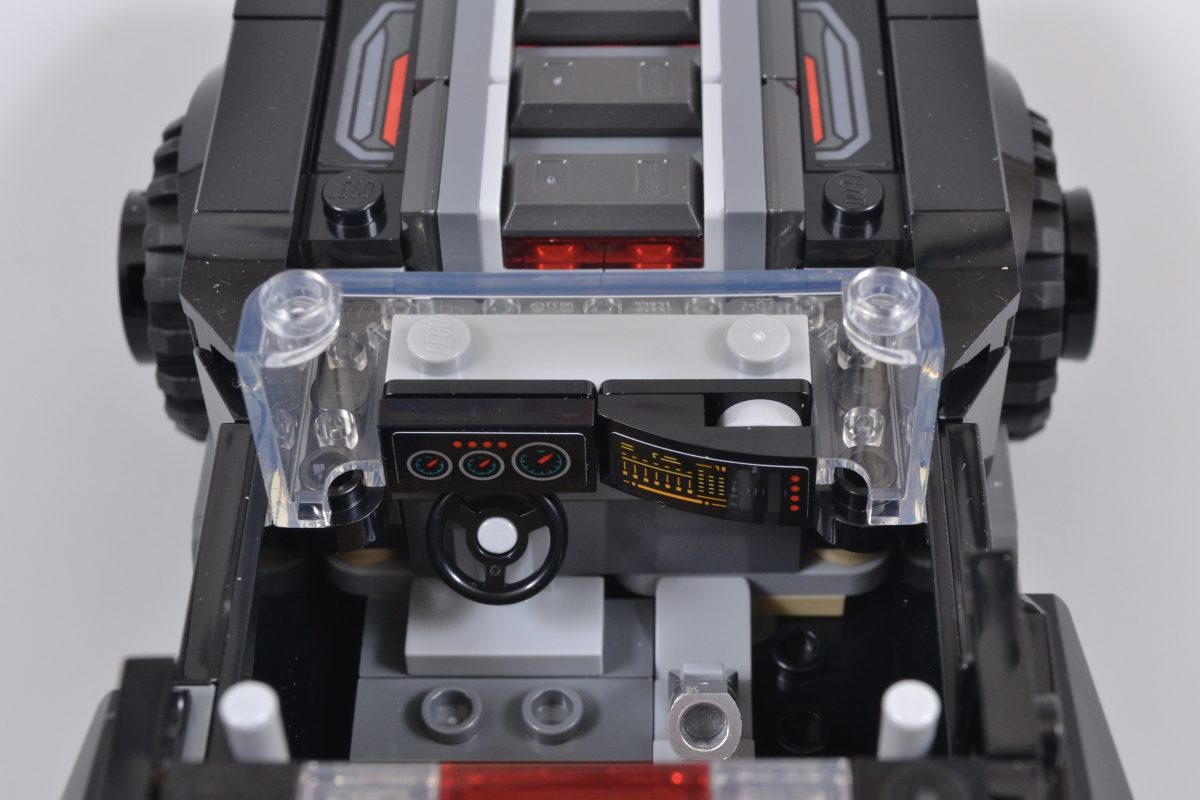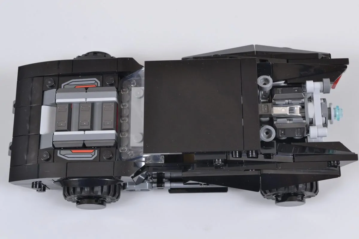 76332 The Batman Batmobile har fortsatt plass til en cockpit i minifigurskala inni, samt en fin finish i form av en sølvfarget girspak med en stangholder og håndtakselement, der bilens tak er en glatt 6×6-flis som mangler irriterende injeksjonsmerker i midten.