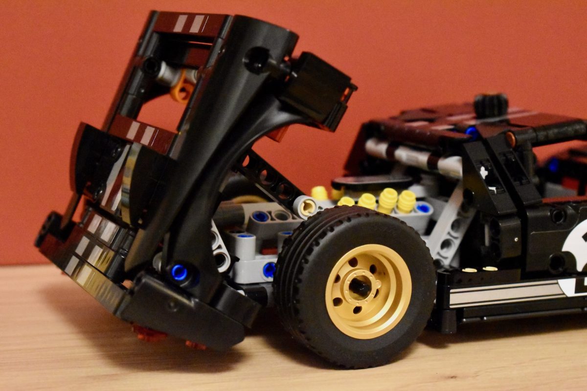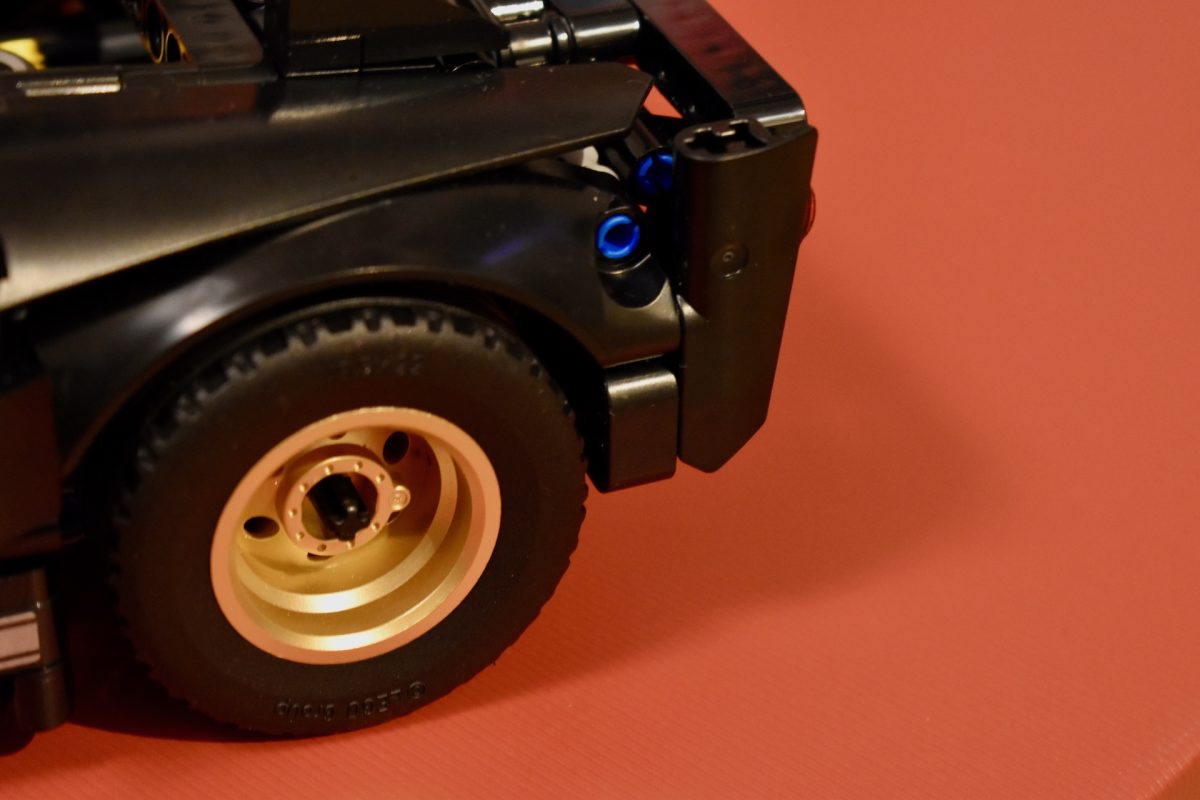 Det finnes noen unike detaljer, inkludert den tredelte panseret, fysiske frontlykter (de fleste Technic-biler bruker bare klistremerker) og gullfargede felger. Felgene er av spesiell interesse fordi de, etter min beste beregning, er på baksiden. Det intrikate eikeverket vender innover, mens de enkle, sirkulære hullene sees på den ferdige konstruksjonen.