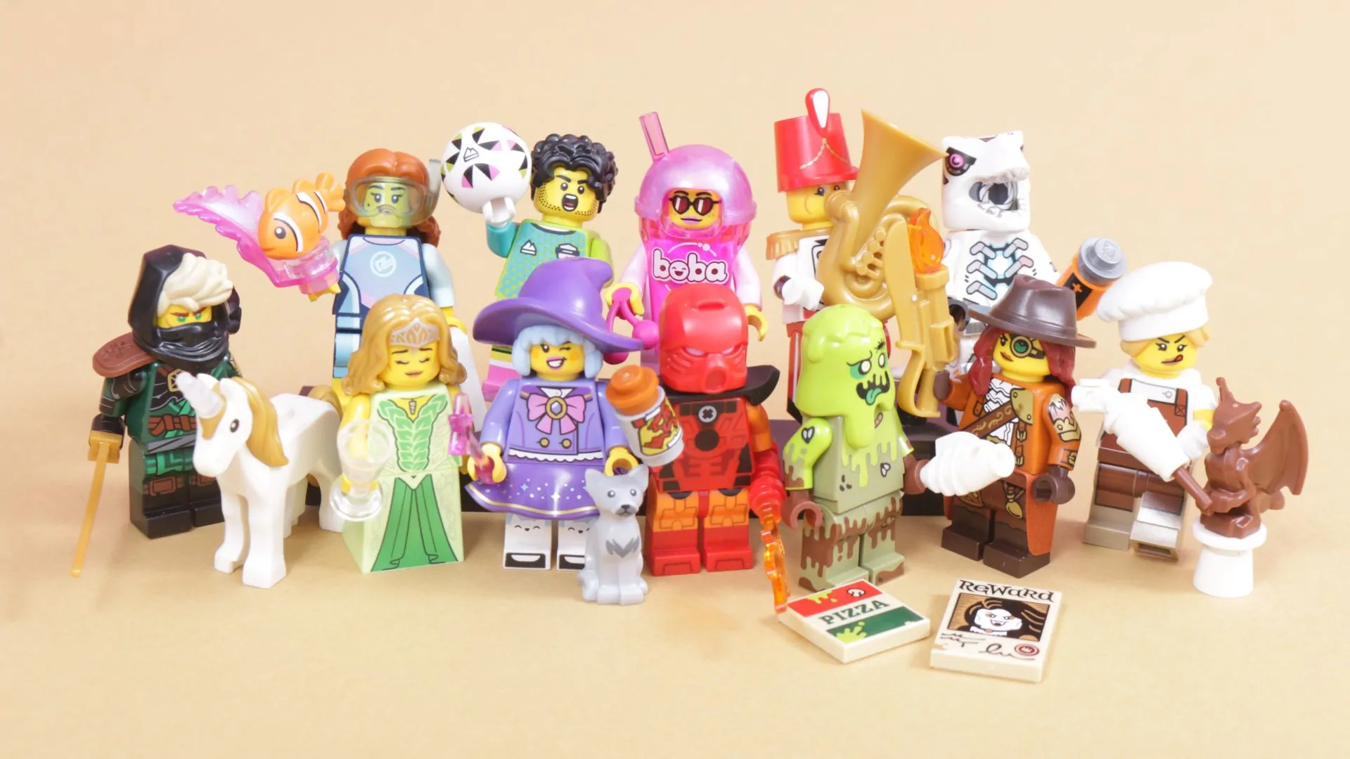 LEGO Minifigures serie 29 inkluderer en tubaistespiller, fotballkeeper, mystisk Ronin, BIONICLE Cosplayer, Boba Cup-fan, marinbiolog, søt heks, enhjørningsnev, robot T. rex, sjokolademaker, monsterjeger og søppelmonster.