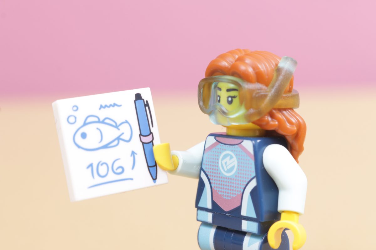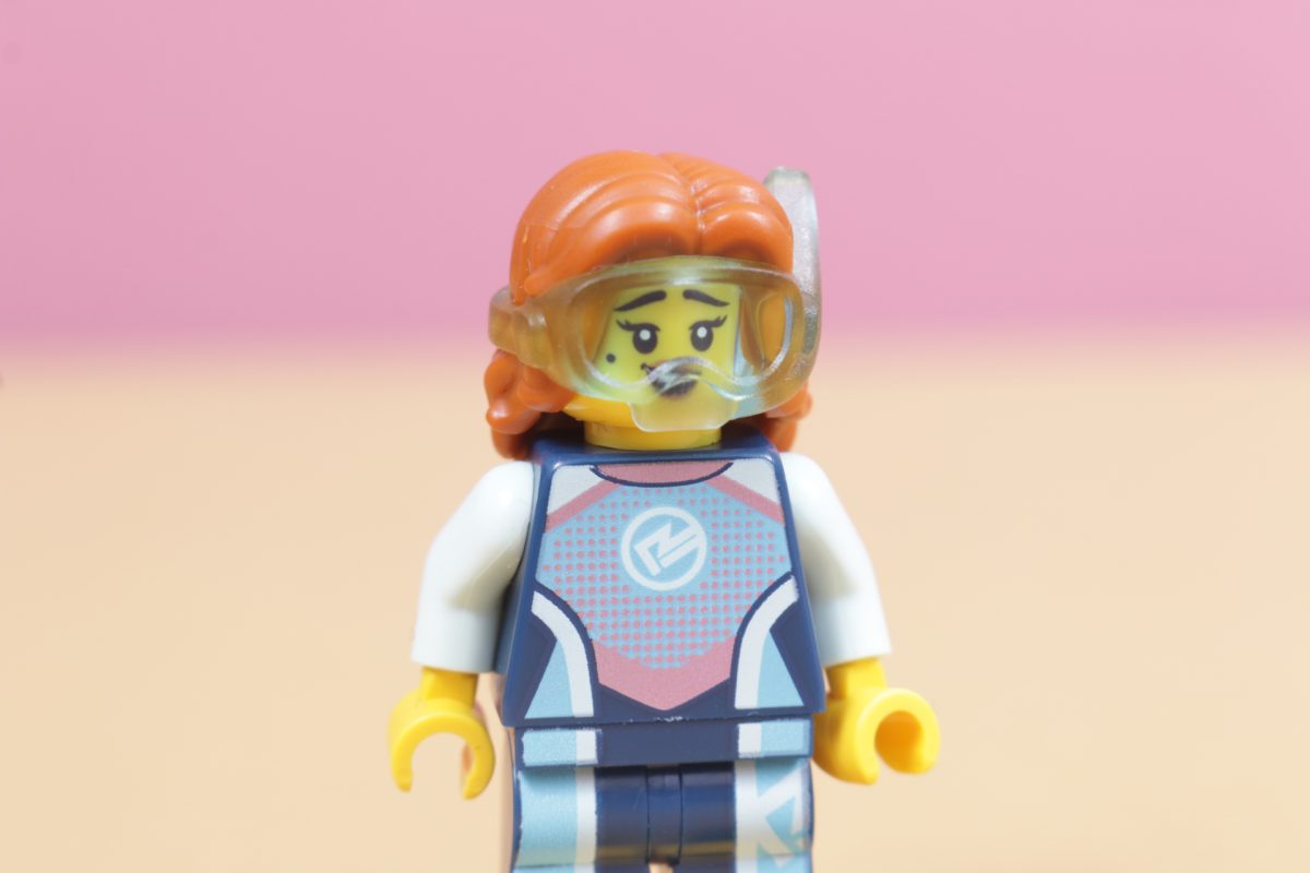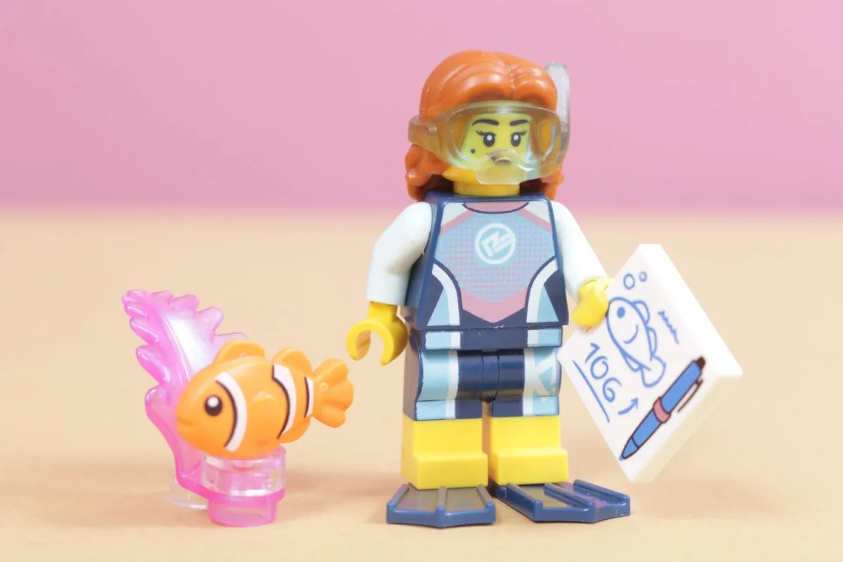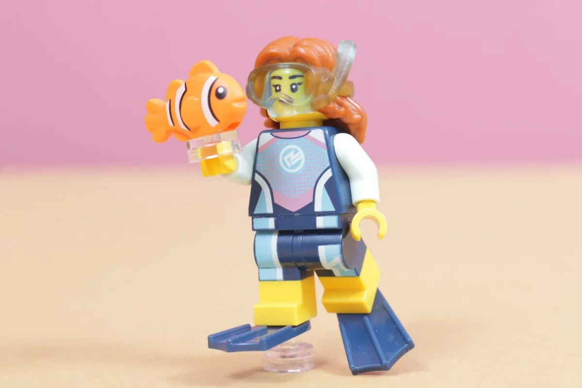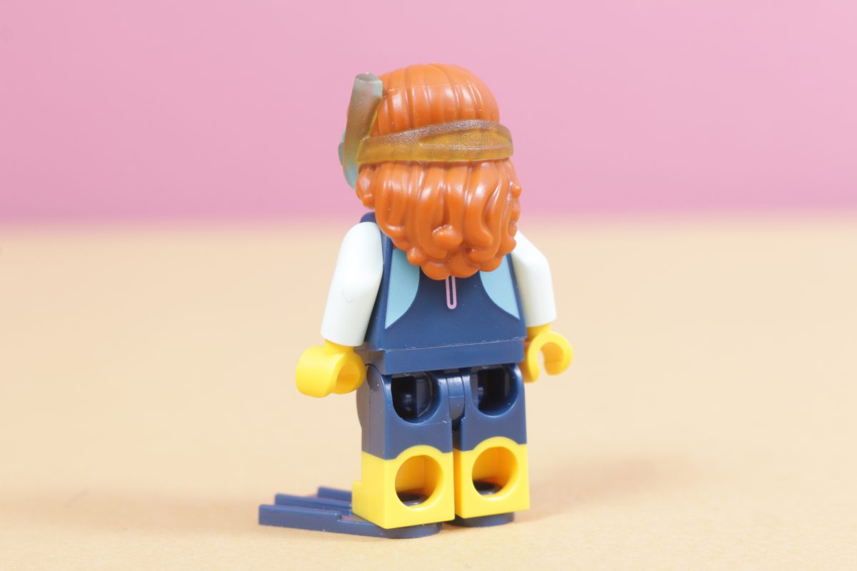 Marinbiologen er en ny vri på et kjent tema for LEGO. Minifigurer har dykket i flere tiår nå, og det er interessant å se hvordan presentasjonen av denne typen figur har endret seg over årene. Denne minifiguren bruker de samme svømmefinnene som har eksistert lenge, men dykkermasken hennes er støpt direkte på håret hennes.