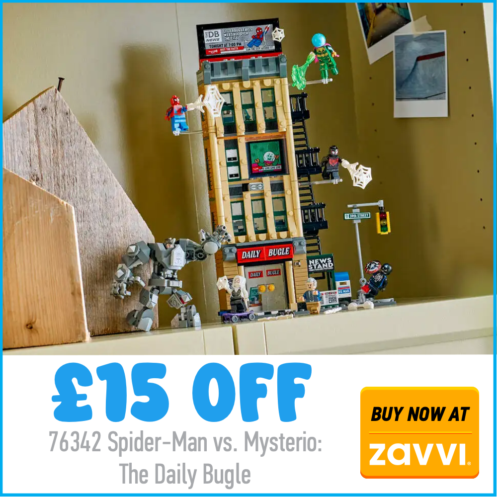 Også en spektakulær superheltrabatt som dukker opp i bildet. 76342 Spider-Man vs. Mysterio: Den daglige bugle. LEGO Marvel Modellen er redusert til kun £84.99 når du bruker koden LEGOMARVEL i kassen, og sparer deg 10 pund på settet med 781 deler.