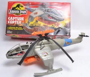 La oss først erkjenne at hele premisset for den originale Jurassic Park-filmen er heltene våre som prøver å komme seg på et helikopter slik at de kan unnslippe Isla Nublar. Så dette kjøretøyet fra 1993, som involverer dem som flyr over hele øya i et helikopter som dinosaurer og fanger badasses i stedet for å kjøre det på land, er latterlig. Bortsett fra det latterlige konseptet, ser det ut til at LEGO-designere har tatt en side fra det gamle lekesettet med sitt eget design. Begge er helikoptre designet for å fange dinosaurer fra luften. Når det gjelder Kenner-leketøyet, var et stort nett inkludert, mens LEGO valgte et klosystem som lurt festet til den medfølgende T-Rex-ryggen
