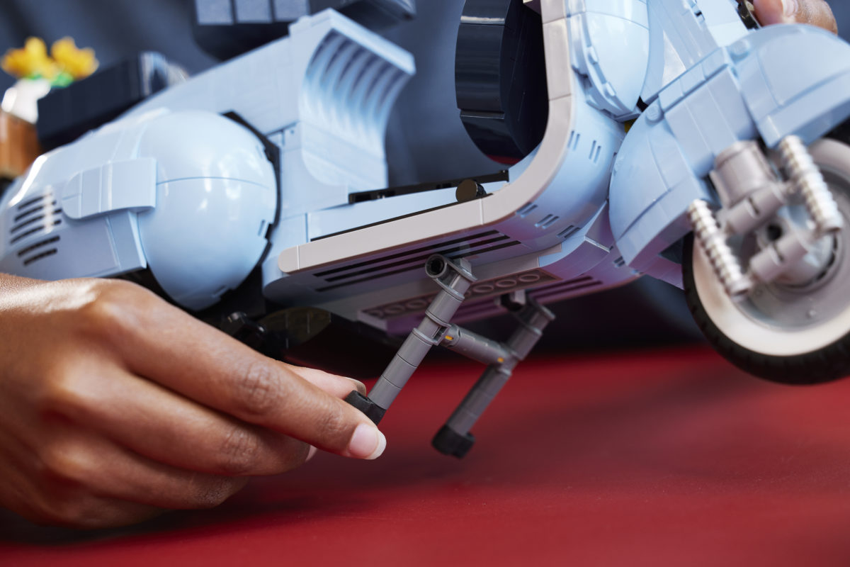 10298 125 XNUMX Vespa XNUMX inkluderer en åpningsseksjon for å se den mursteinsbygde motoren, styringen og støttebenet. Det er færre funksjoner enn andre LEGO ikoner kjøretøyer, med modellen rettet mer mot visning, komplett med interessante vinkler og kurver hele veien.