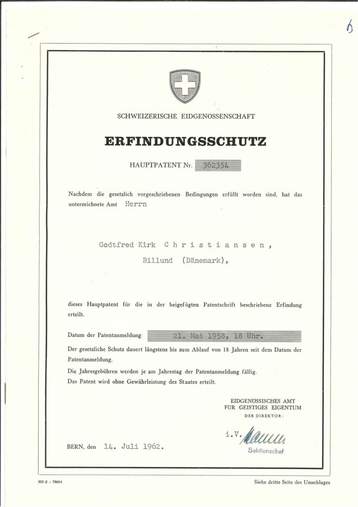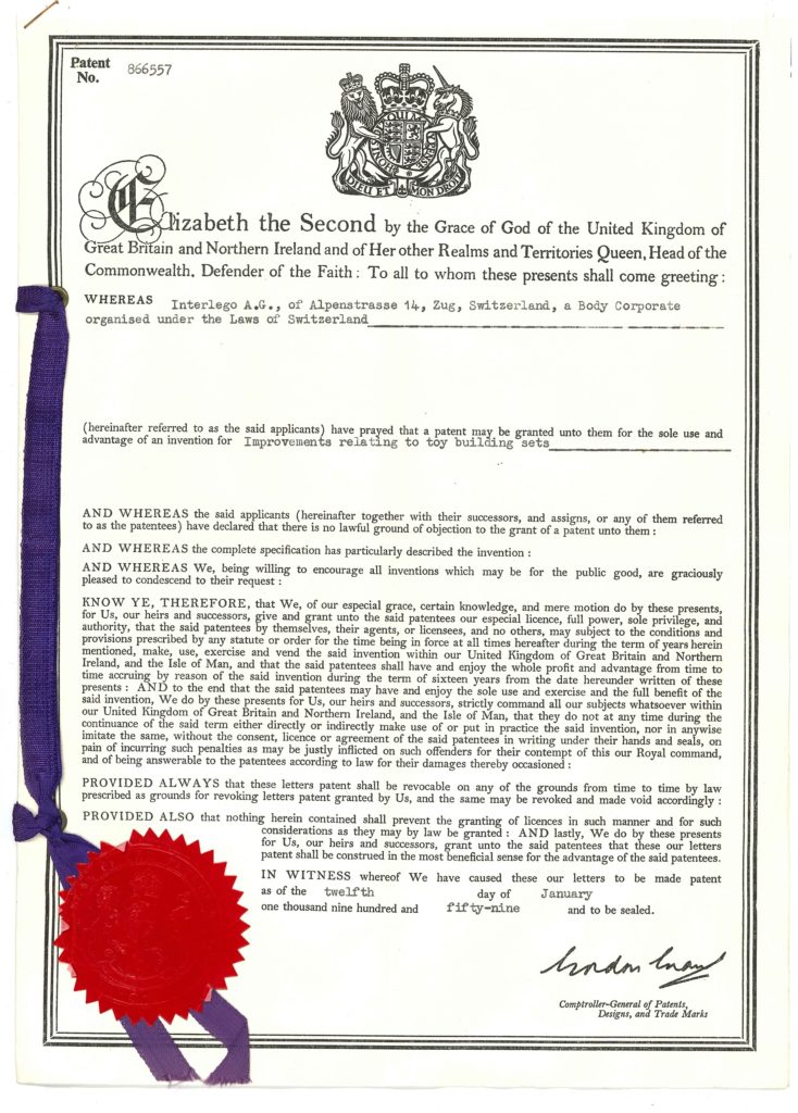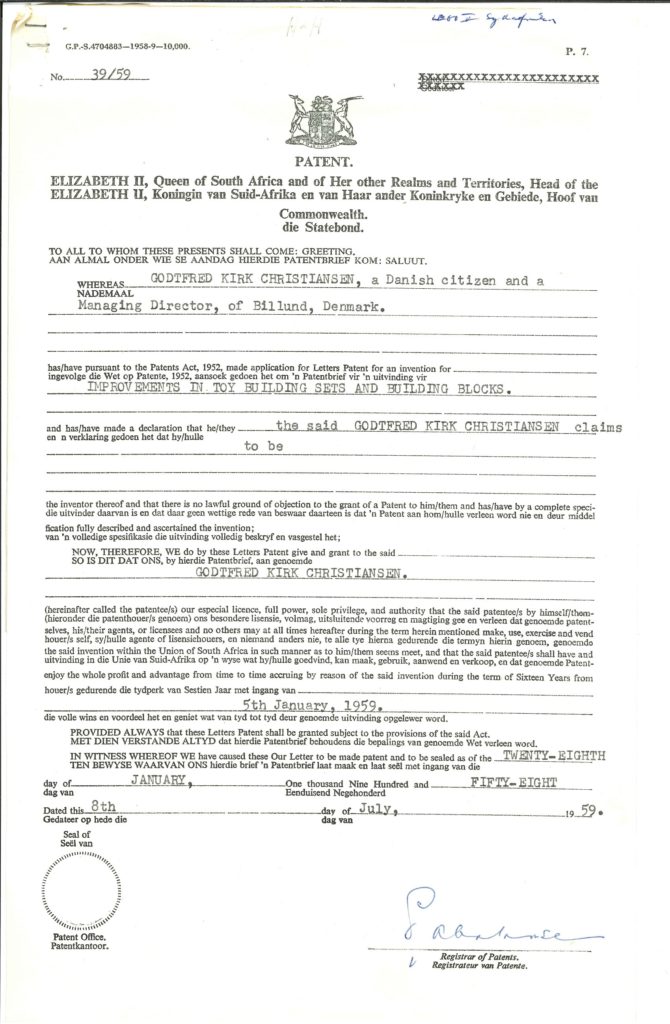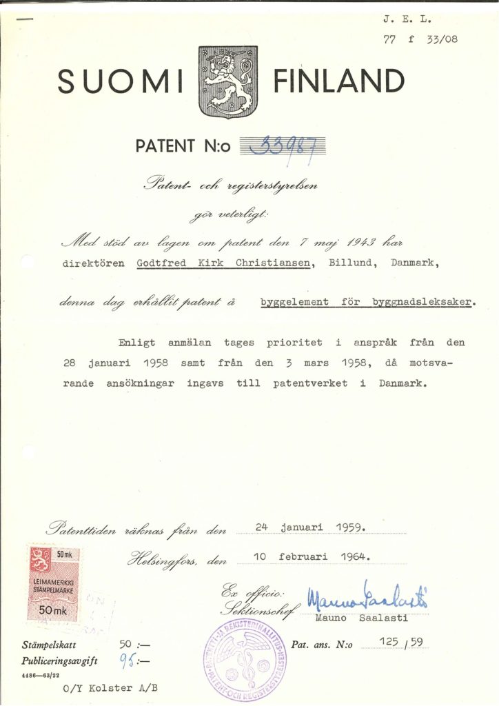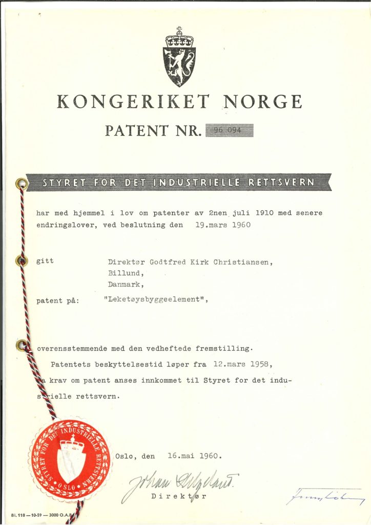 Faktisk, i månedene som fulgte Godtfreeds første søknad, ble LEGO Group inngitt patenter i land over hele Europa, inkludert Norge, Sverige, Tyskland og Holland. Og ved slutten av 1959 hadde LEGO-klossen blitt patentert over hele verden, fra Storbritannia og Tyrkia til Israel og Sør-Afrika.