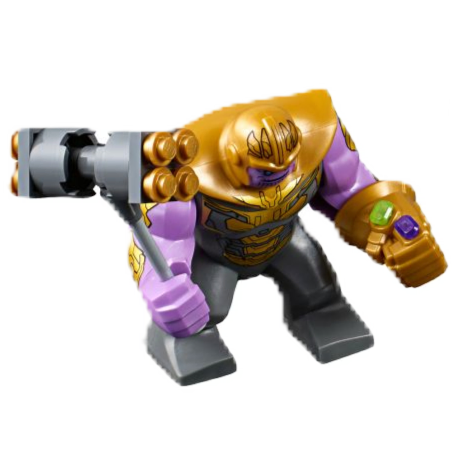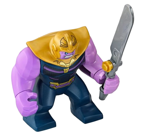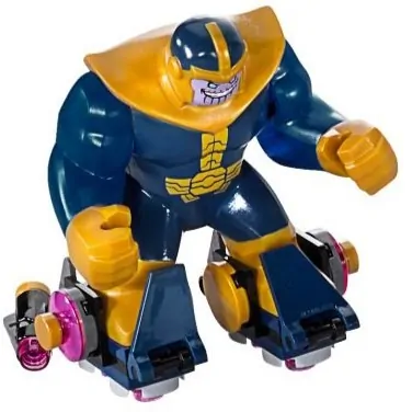 Thanos står bak Hulk som den mest populære LEGO Marvel karakter for bigfigs, og mottar fem forskjellige versjoner som starter i 2016s 76049 Avenjet Space Mission. Denne tegneserieinspirerte versjonen av Thanos brukte en form med hjelmen permanent festet, som opprinnelig ble gjenbrukt for Marvel Studios bigfig.