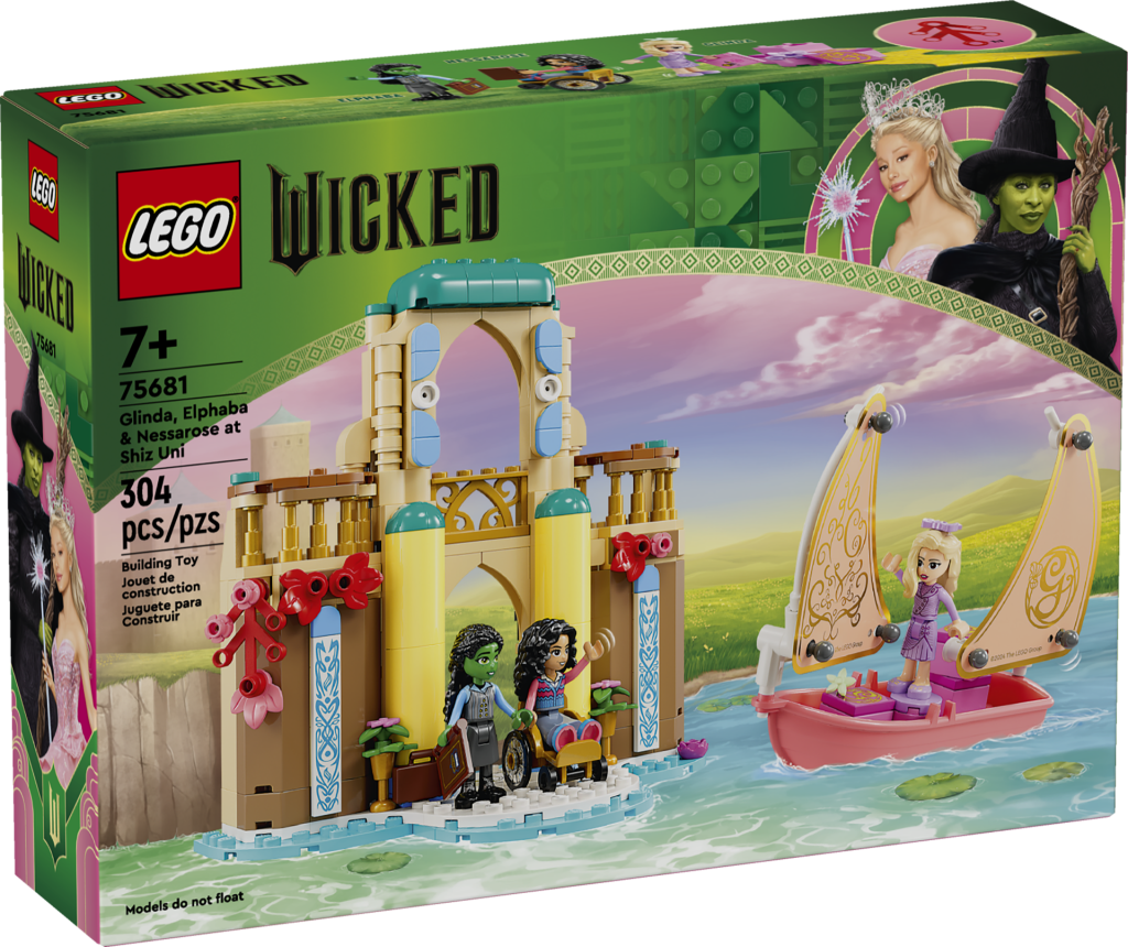 Det minste og billigste LEGO Wicked-settet inneholder minidukker av Glinda, Elphaba og Nessarose, og gjenskaper øyeblikket Glinda ankommer Shiz University i Oz ombord i seilbåten sin. Selve bygningen er en liten fasade som ligger over to etasjer som pakker inn et soverom, bøker og et skap fylt med glassflasker. Men det virkelige høydepunktet i 75681 Glinda, Elphaba & Nessarose ved Shiz Uni kanskje bare den rosa robåten...