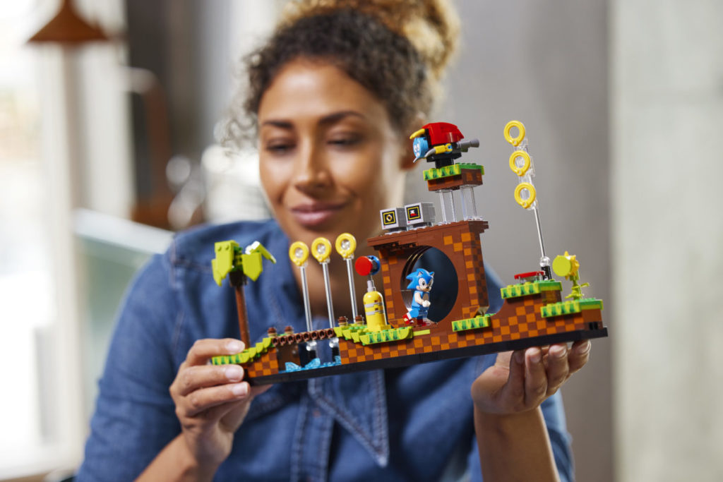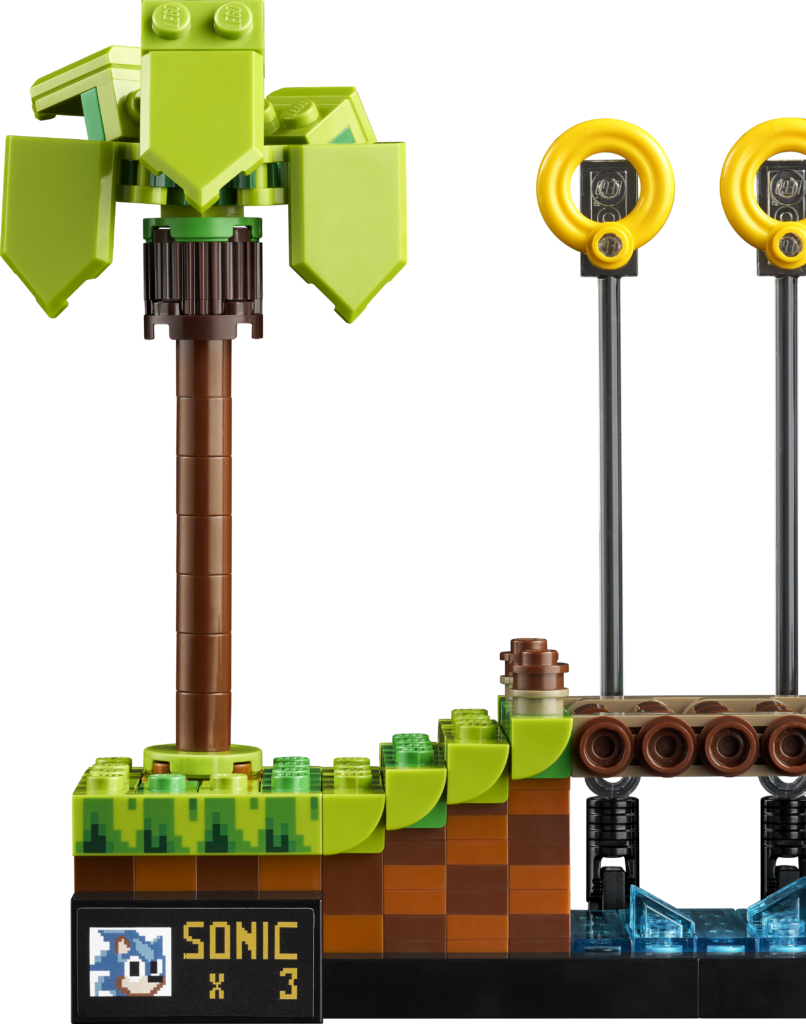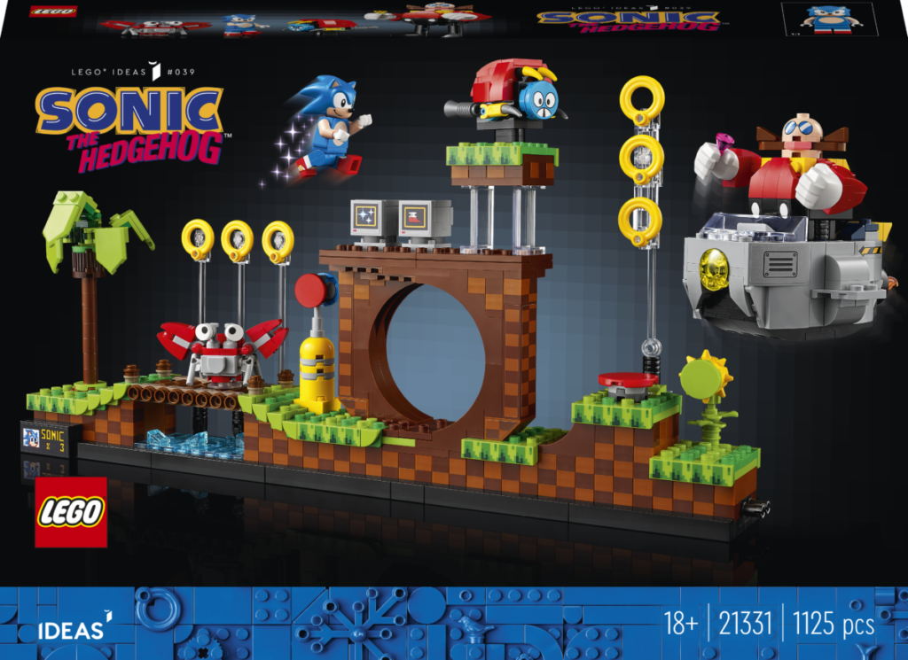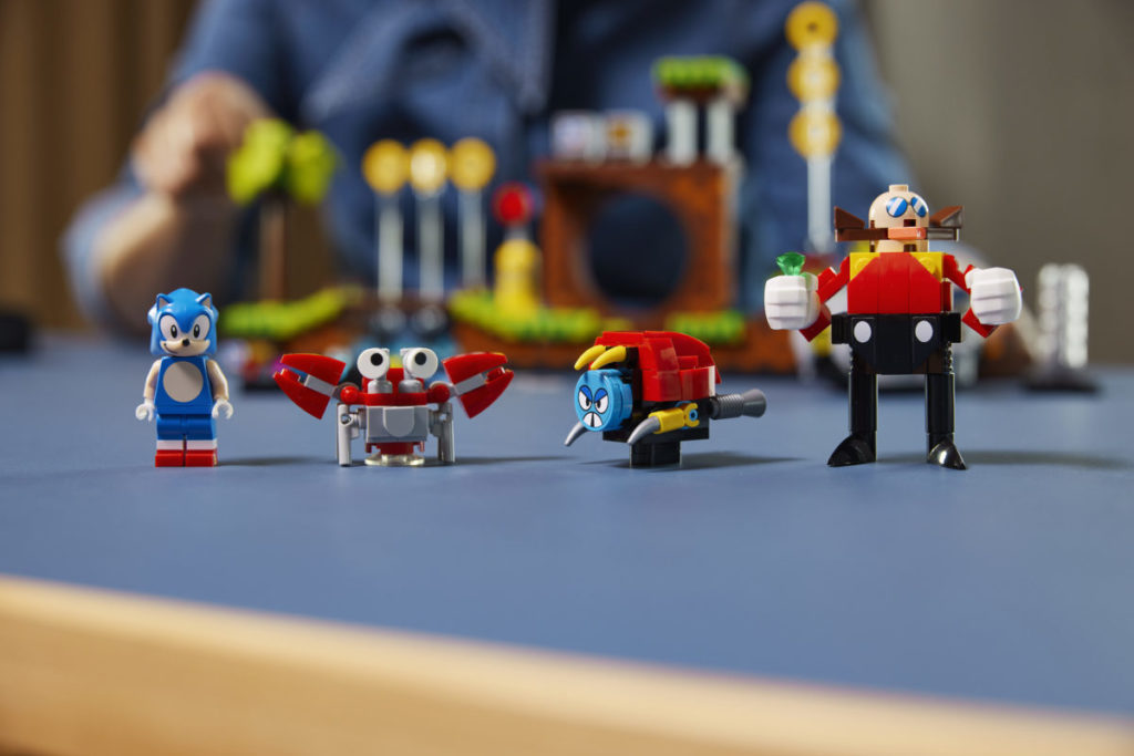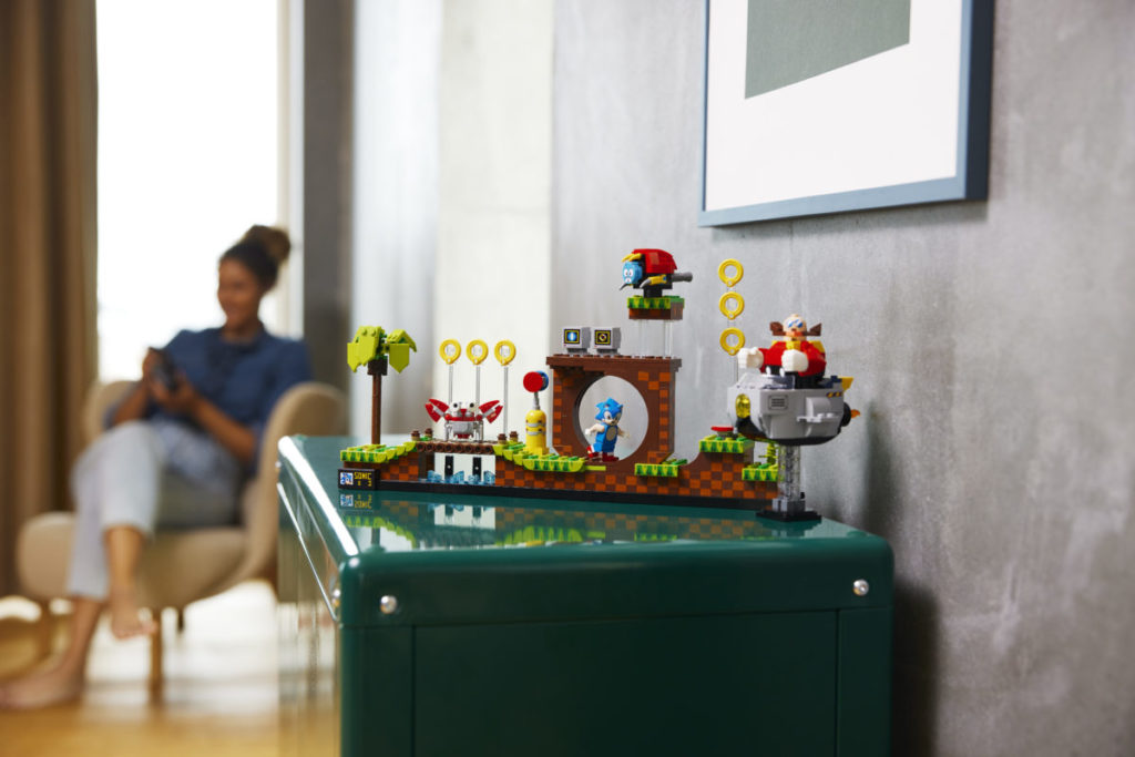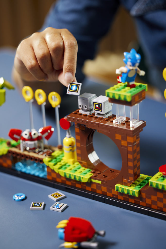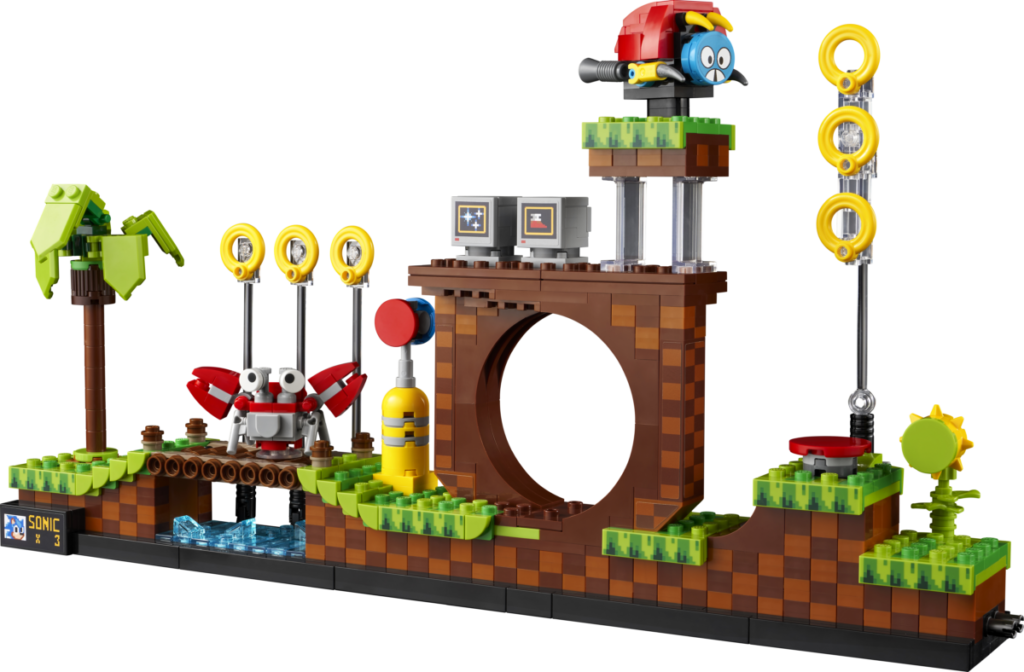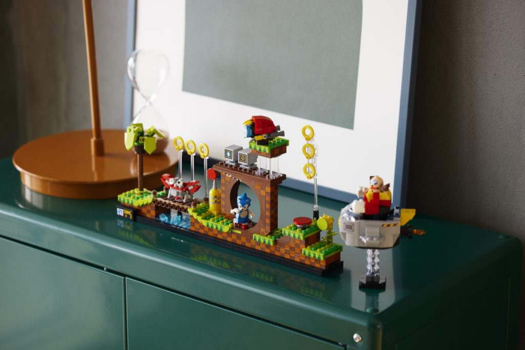 Det etterlengtede settet på 1,125 10 deler, presentert som en fire-pins dyp gjenskaping av det todimensjonale videospillets Green Hill Zone, inkluderer fem karakterer – Sonic, Dr. Eggman, Crabmeat, Moto Bug og Phantom Ruby (som er oppført på listen) som en minifigur i pressemeldingen) – og XNUMX esker med gyldne ringer som den piggete blå fyren kan samle.