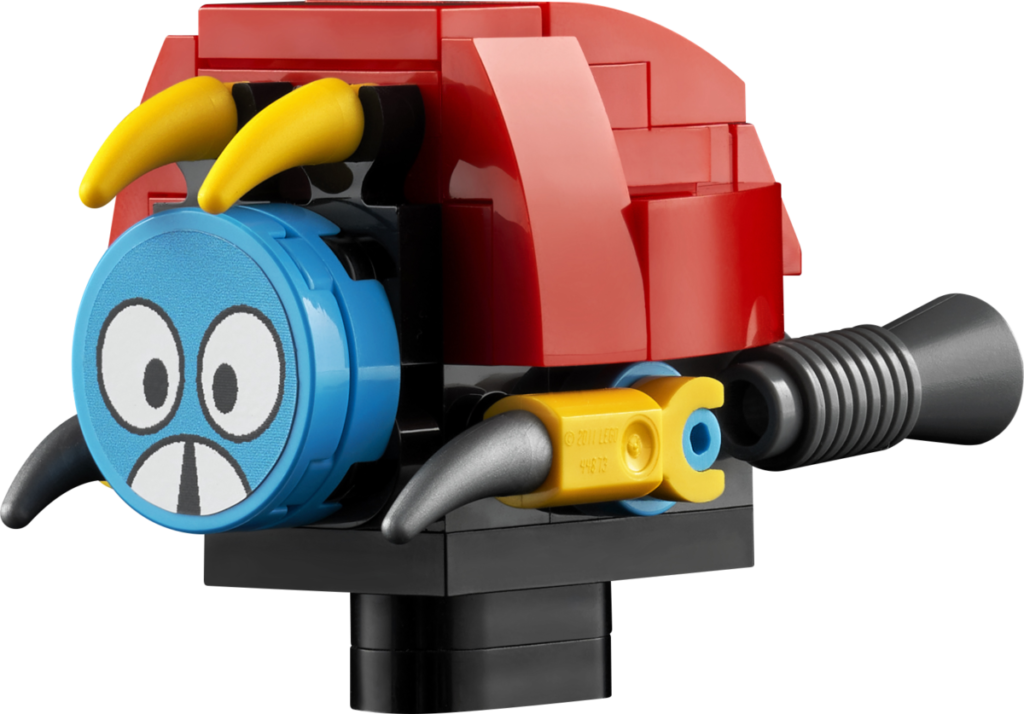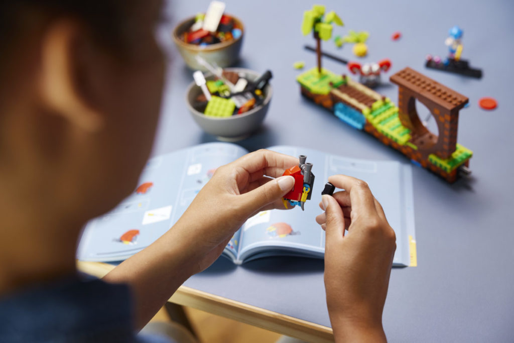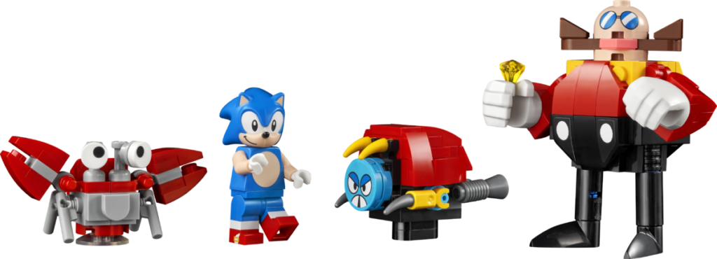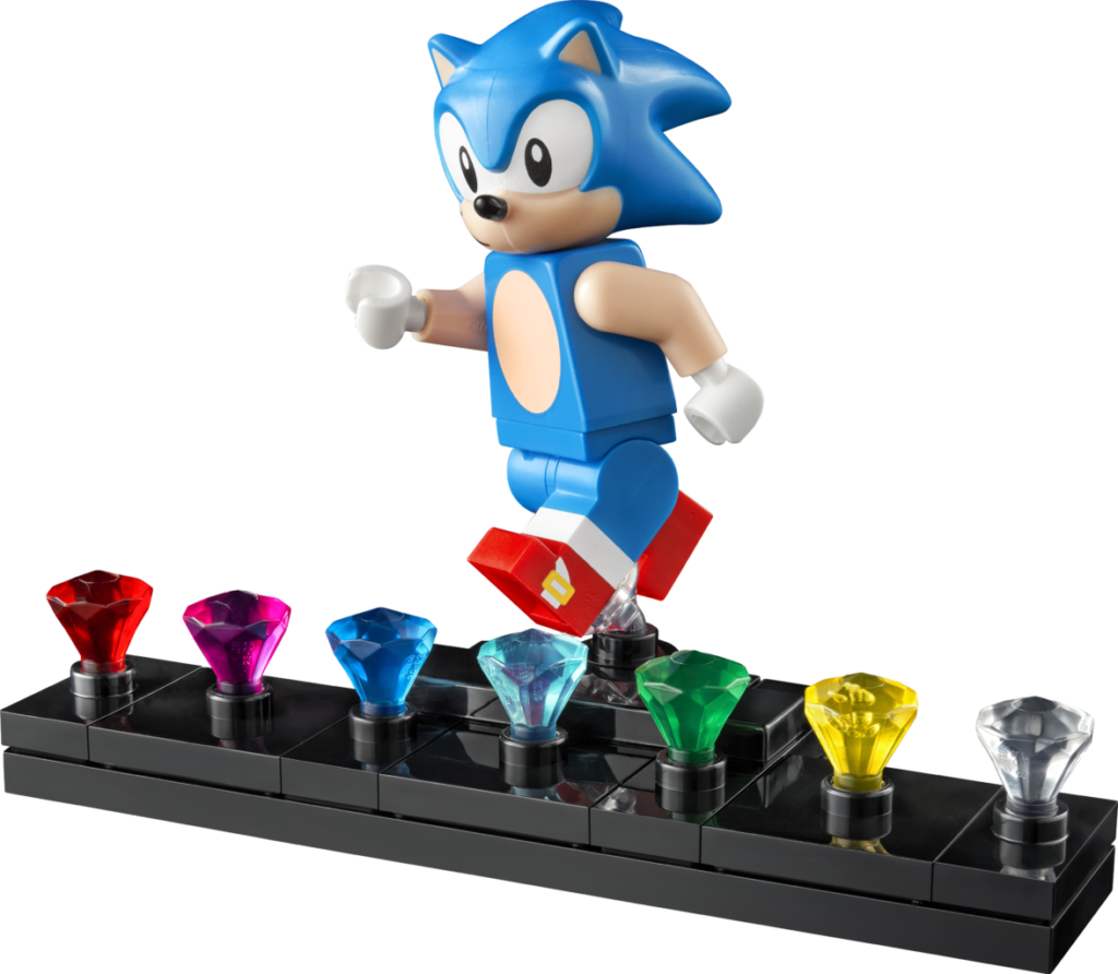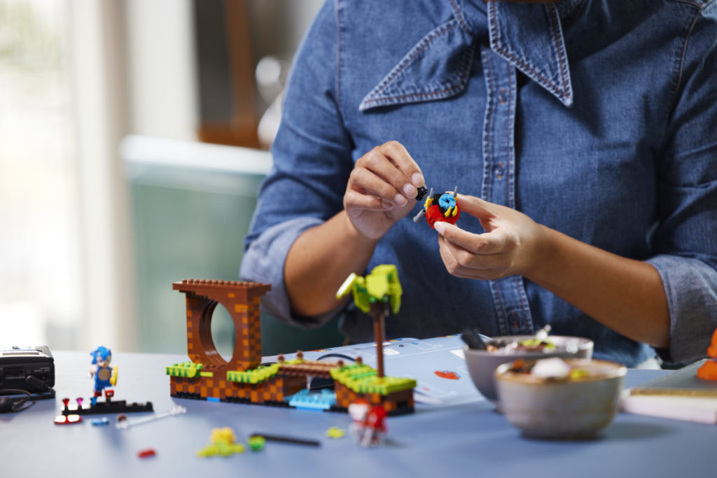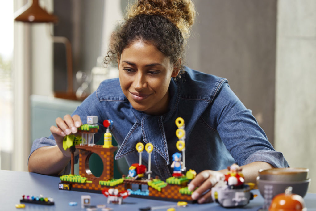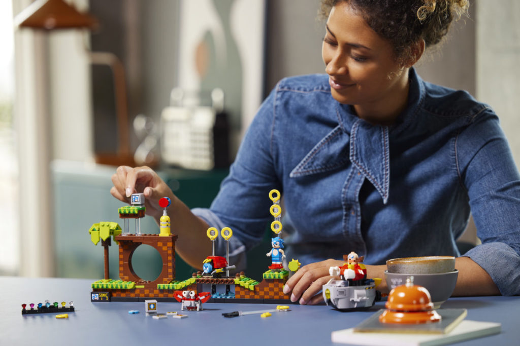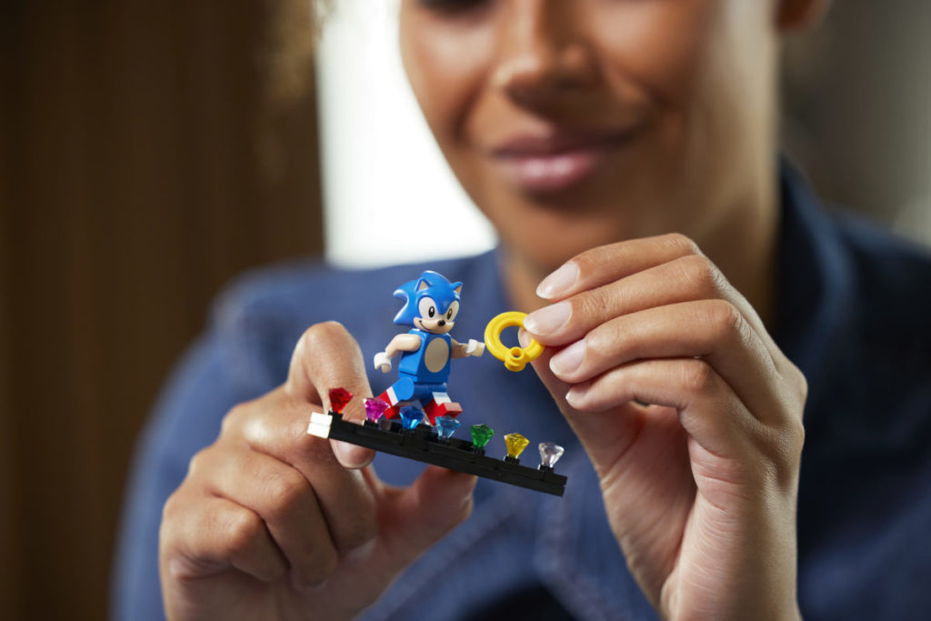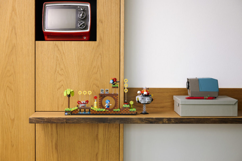 Det etterlengtede settet på 1,125 10 deler, presentert som en fire-pins dyp gjenskaping av det todimensjonale videospillets Green Hill Zone, inkluderer fem karakterer – Sonic, Dr. Eggman, Crabmeat, Moto Bug og Phantom Ruby (som er oppført på listen) som en minifigur i pressemeldingen) – og XNUMX esker med gyldne ringer som den piggete blå fyren kan samle.