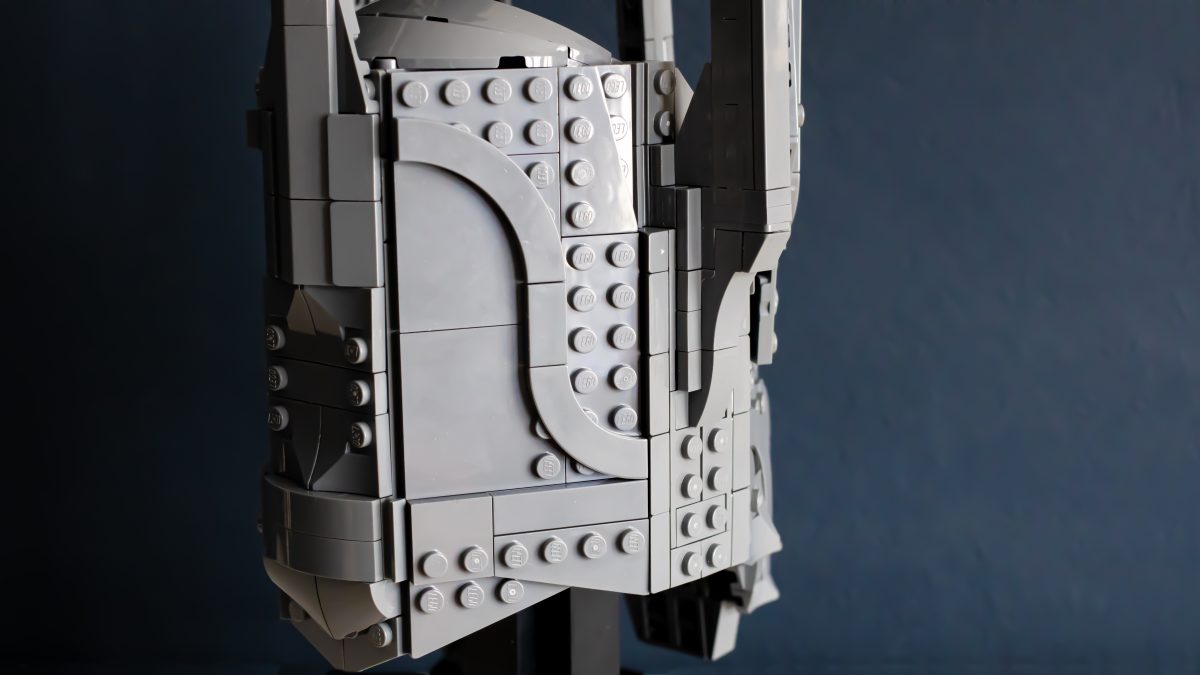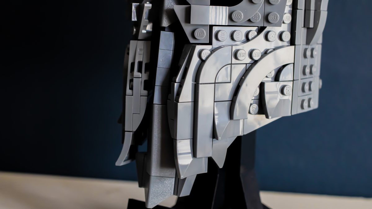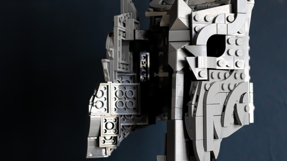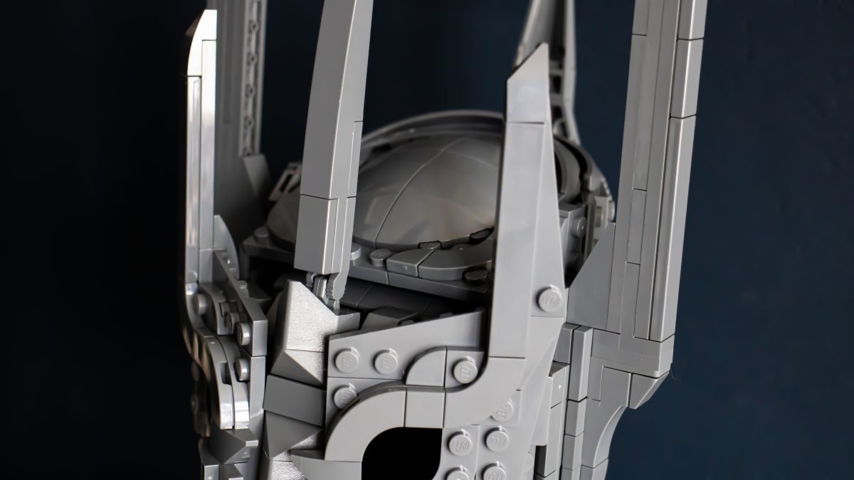 Derfra blir ting overraskende intrikat. Den indre kjernen bruker et tett gitter av knotter, stenger og klips, som danner et stivt rammeverk som hjelmens dramatiske geometri er lagt lagvis på. Delenheter svinger og hengsler på plass, og former gradvis kuppelen og de umiskjennelige, barberbladede kinnplatene. Det er smart og tilfredsstillende LEGO-design, med en rytme som holder byggingen engasjerende gjennom hele prosessen.
