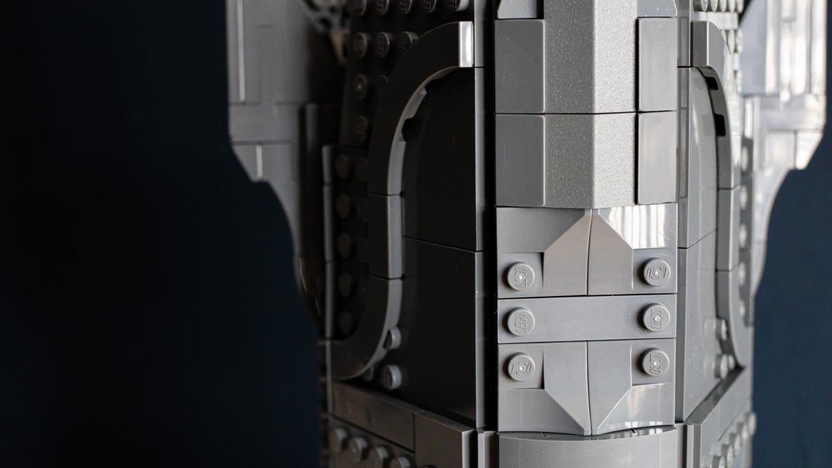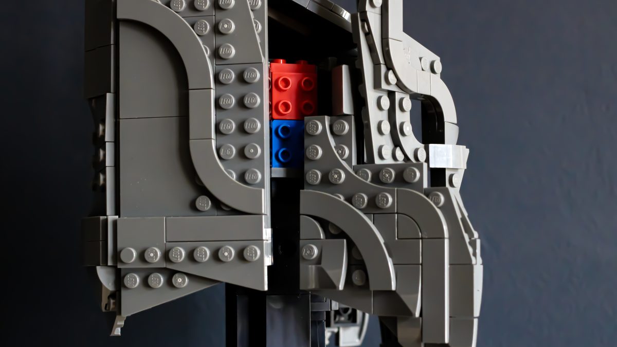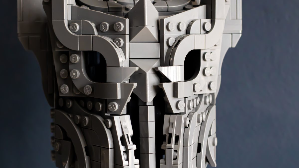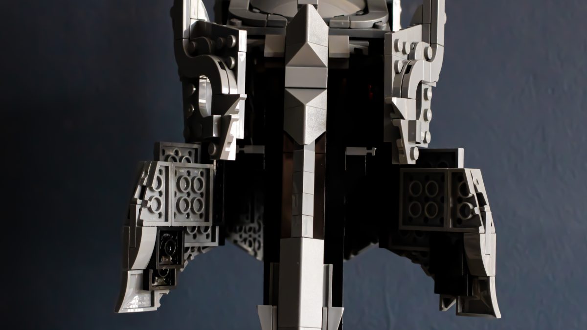 Derfra blir ting overraskende intrikat. Den indre kjernen bruker et tett gitter av knotter, stenger og klips, som danner et stivt rammeverk som hjelmens dramatiske geometri er lagt lagvis på. Delenheter svinger og hengsler på plass, og former gradvis kuppelen og de umiskjennelige, barberbladede kinnplatene. Det er smart og tilfredsstillende LEGO-design, med en rytme som holder byggingen engasjerende gjennom hele prosessen.