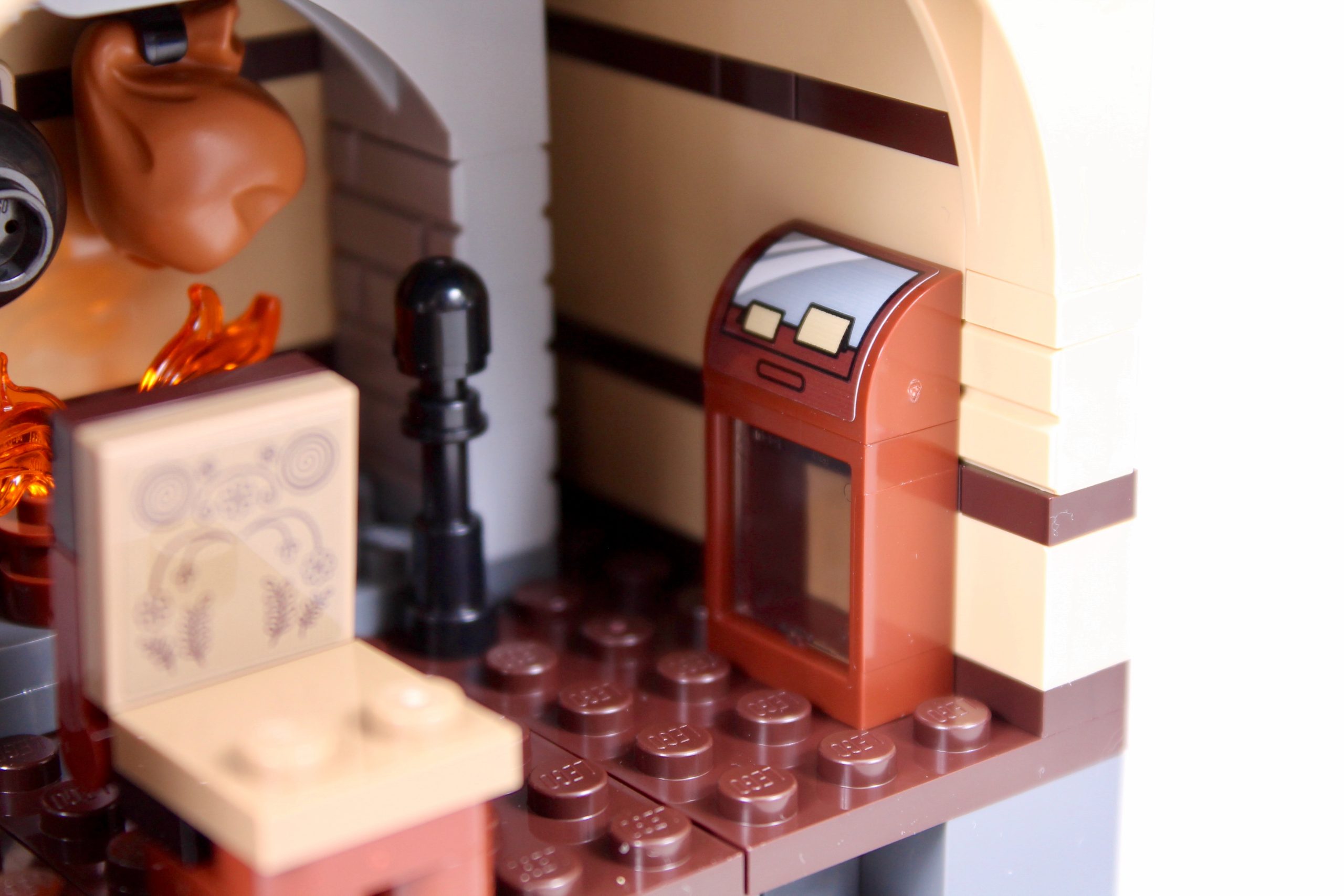 Designerne har lekt raskt og løst med innredningen, men det var god plass til kreativ tolkning: man får faktisk ikke ordentlig grundig innblikk i hyttas interiør i filmen, og det er selvfølgelig et filmsett de kan få tak i. unna mye mer, så ingen burde ringe 21341 Disney Hokus Pokus: Sanderson Sisters' Cottage ute etter unøyaktigheter. Mer presserende er et par særegne designbeslutninger – en av kostene har ikke noe sted å klippe eller stikke inn, og hviler bare usikkert mot en vegg til du uunngåelig slår den ut av plass – men de blir overskygget av de morsomme teknikkene spredt over hele modellen.