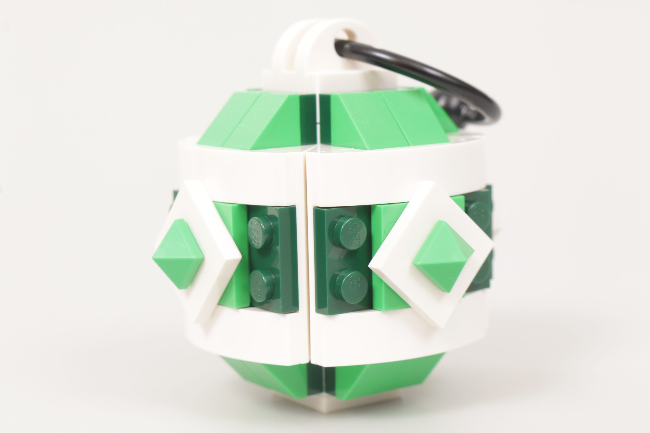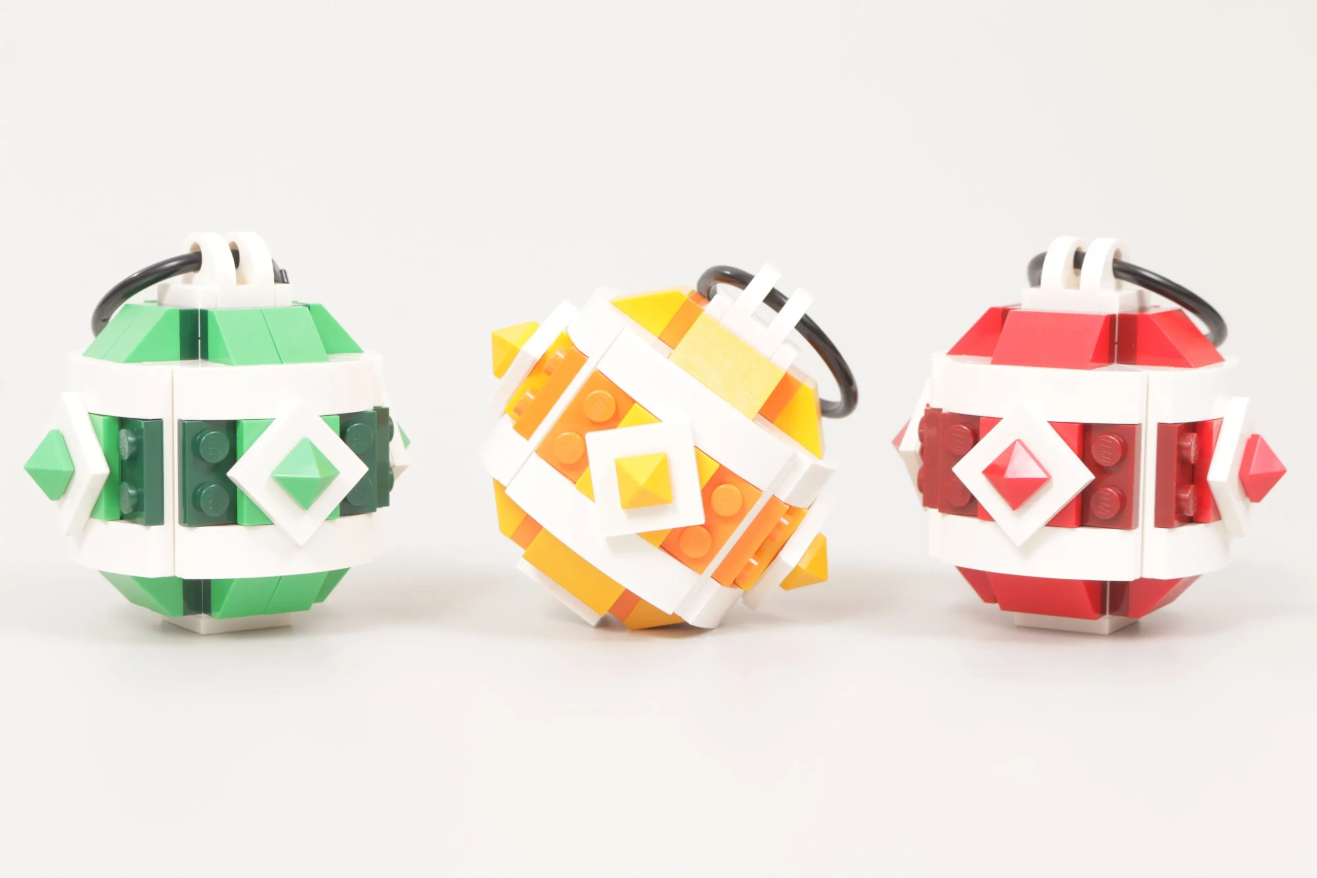 For å bruke terskelen mottar du en pakke med tre byggbare julepynt i tre forskjellige farger. Selv om designet for de tre er nesten identisk (bortsett fra den grønne med 1×2 skrånende klosser i stedet for 2×2 skrånende klosser), og det betyr at byggingen av dem er ganske repeterende, er det av en bredere grunn, som er at sidene til hver dekorasjon kan løsne og du kan mikse og matche farger og mønstre på tvers av de tre.