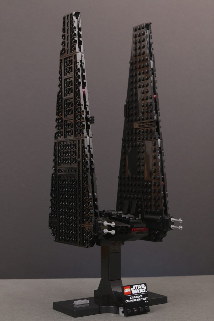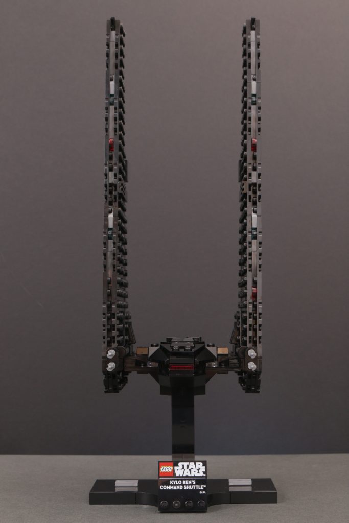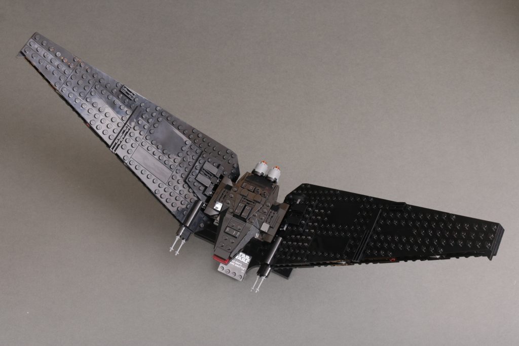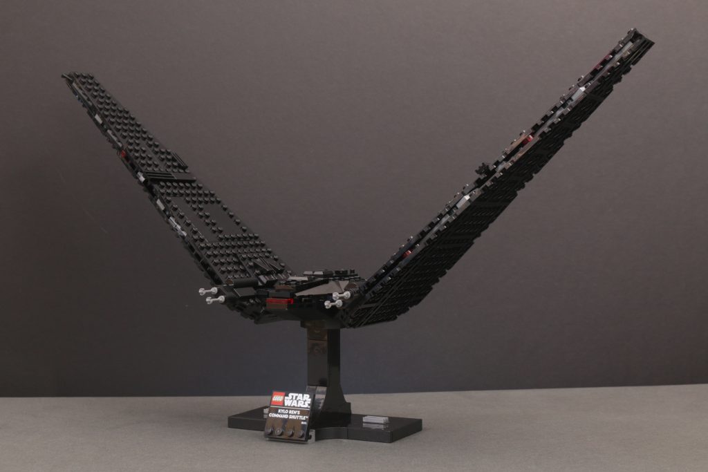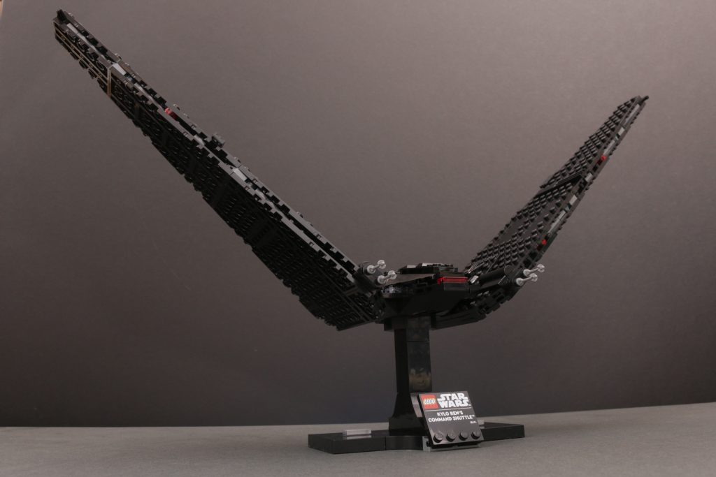 Kort sagt, vingene er massive og de skaper dette ganske utrolig imponerende skipet når det er ferdig. I landingsmodus står de utrolig høye i rimelig forhold til skipets kropp, mens de i flymodus fyller utrolig mye plass for å skape en aura som de to minifigurskala-versjonene av dette samme skipet aldri egentlig kunne.