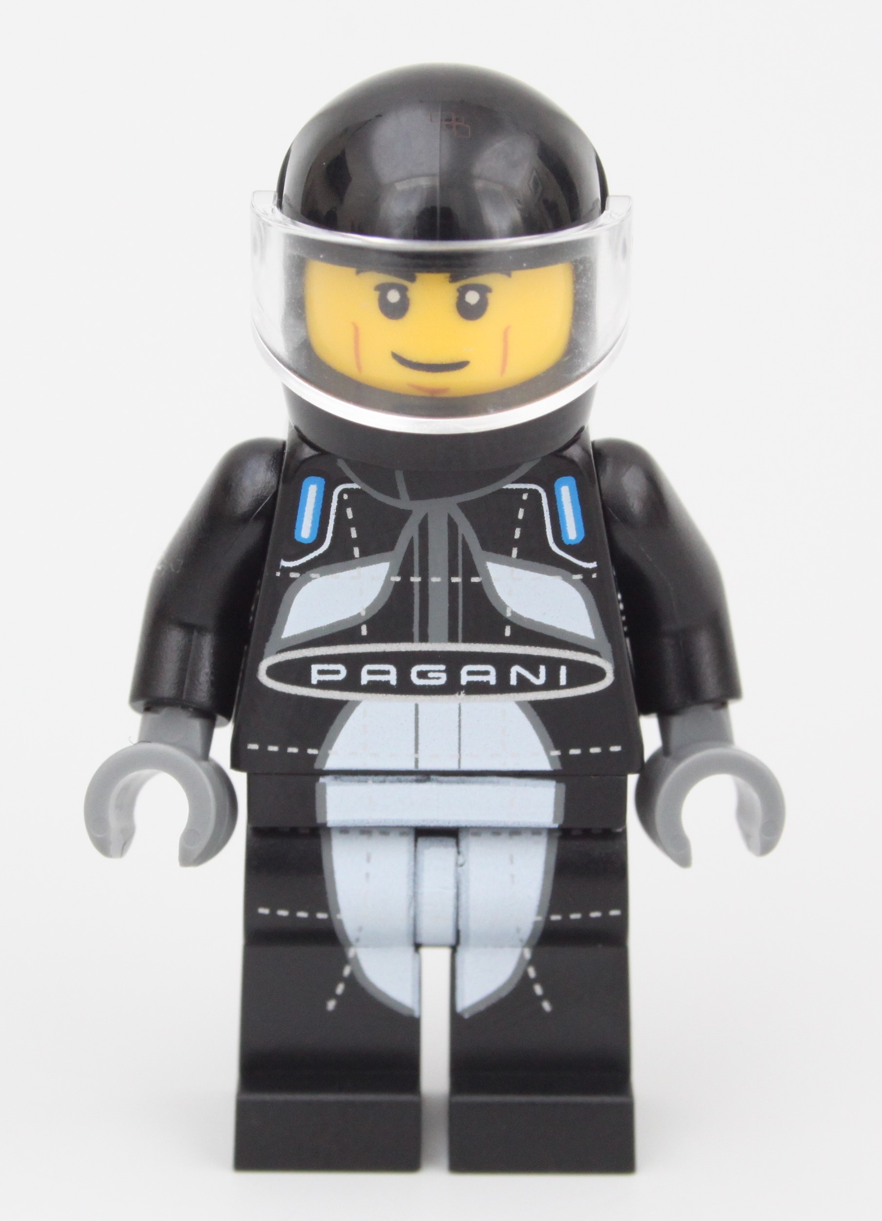 Minifiguren har på seg en slående svart og hvit racerdress med en imponerende mengde trykk som jevnt overføres fra overkroppen til midjen og deretter til bena. Det er en fin bonus på toppen av hovedbygget i 76915 Pagani Utopia, men denne driveren kommer ikke til å være et stort salgsargument for settet for noen.