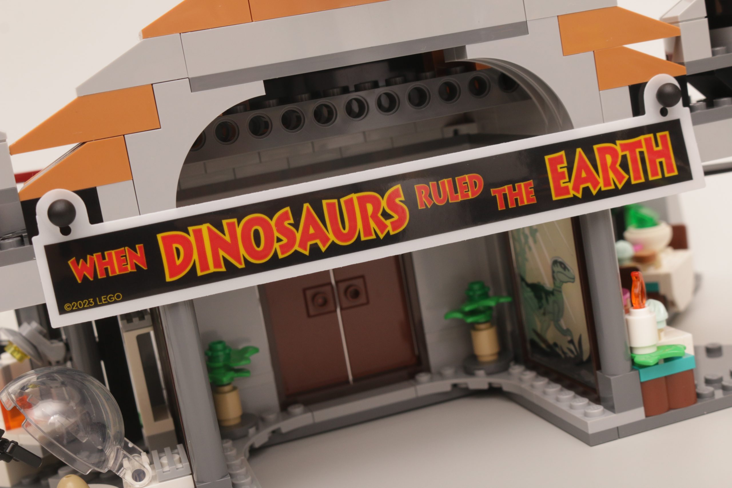 Alle minifigurene kan fortsatt passe inn i og rundt modellen, og det er gode muligheter for lek som et resultat, men mikroskalastørrelsen på eksteriøret gjør at interiøret er alt, altfor lite til å komme i nærheten av det vi så på skjermene. . En del av besøkssenterets fortreffelighet som ramme for filmens finale lå i dets storslåtte interiør, som lett kunne huse en klimaktisk jakt mellom Velociraptorer og mennesker oppover noen gigantiske, suspenderte dinosaurskjeletter, og deretter – enda viktigere – en rasende T. rex. Som det er, det fancy 'When Dinosaurs Ruled The Earth'-skiltet som følger med 76961 Besøkssenter: T. rex & Raptor Attack sitter ganske komisk for lavt, omtrent på høyde med den medfølgende T. rex sine hofter, i stedet for høyt nok til at den dramatisk faller ned rundt dinosauren mens den brøler, a la filmen.
