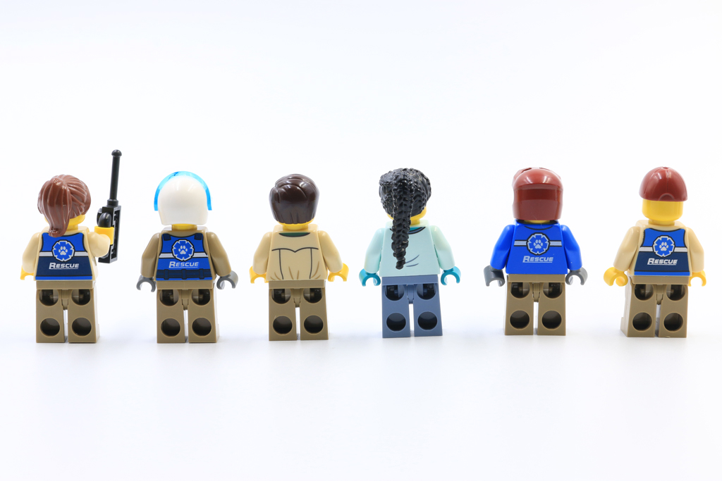 60307 Wildlife Rescue Camp kommer med imponerende seks minifigurer, men ingen er unike for dette settet. De fem rangerne har forskjellige overkropper avhengig av rollene deres, fra det detaljerte trykket på pilotens flyjakke til de mange praktiske lommene på resten av teamet. Veterinærdesignet er kun tilgjengelig i ett annet sett, 60302 Wildlife Rescue Operation, med blågrønne hender som imiterer latekshansker og skrubbene hennes trykket med et stetoskop. Hun har også et nytt, detaljert hårstykke, som er vakkert formet med en strukturert flette.