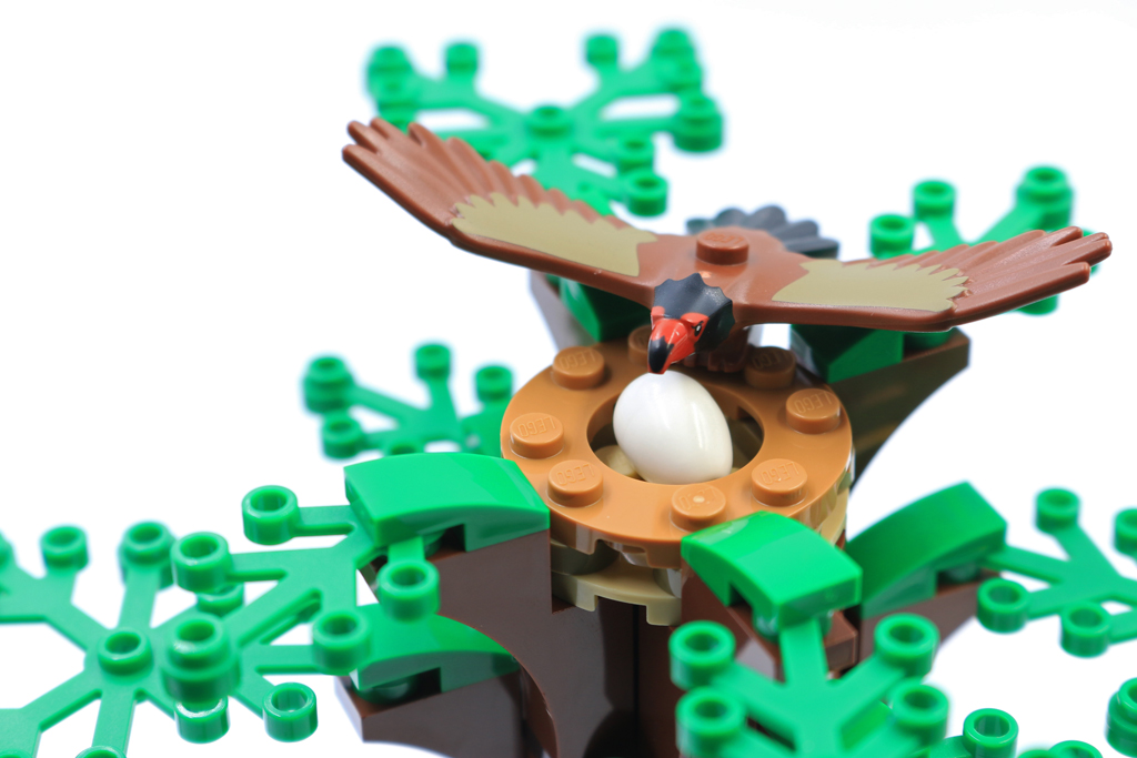 Det samme gjelder bonsai-treet. Selv om det er smart hvordan det vokser ut av fjellveggen, fremstår det bare nesten uferdig med en glatt sylindrisk stamme og noen få bladelementer. Det er ingen ekstra detaljer som blomster eller en LEGO-edderkopp som dingler fra en gren. Det gir heller ikke så mye å sette et egg på toppen, spesielt med bare en enslig forelderørn.