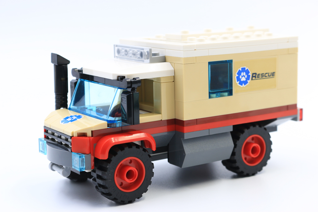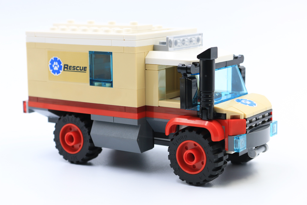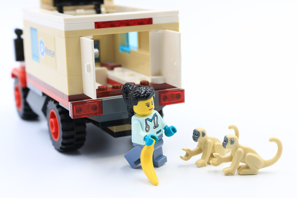 Kanskje en av de beste delene av dette settet er redningsbilen. Med over 16 pigger lang er den solid og solid nok til å overleve turer rundt på savannen eller utforske stuen. Ulike plater i rødt bygger opp chassiset, mens lysebrune klosser danner hytta, med de to fargene som fungerer fint sammen. På innsiden gir hvite fliser et rent medisinsk preg til et fungerende laboratorium, komplett med datamaskin og mikroskop. Mikroskopet er laget av bare fire deler og ser fantastisk ut, på genial vis med en minifigurkikkert for okularet.