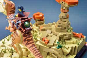 Til tross for å være det definerende elementet i en LEGO murstein, kan pigger ofte være stygge. For å bekjempe dette problemet, bør byggere prøve å utvikle et visuelt språk der pigger kan være fornuftige. I dette tilfellet ønsket jeg at den blåste sanden skulle fremstå glatt, bortsett fra i fotsporene til Obasi, som har sparket støvskyene opp. Å forlate sporadiske pigger som vises i rockearbeidet, lot meg også endre teksturen litt. Ved å skape mer fløyede former for mange av fjellformasjonene, blir piggene ganske enkelt små bergarter eller steinblokker. For å bidra til å utvikle proporsjon så vel som kontekst i scenen, trengte jeg å ha et tårn av stein litt høyere enn Obasi. Dette skaper dybde ved å gi betrakteren sjansen til å sammenligne Nomusas størrelse med både Obasi og miljøet de bor i. Hvis det ikke var noe høyt objekt å kontrastere med, ville Obasis tilstedeværelse virke som overkill. Ved å skape en balanse, viser det at selv den største skapningen fremdeles er liten sammenlignet med det generelle miljøet.