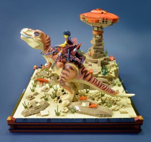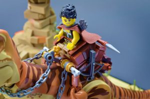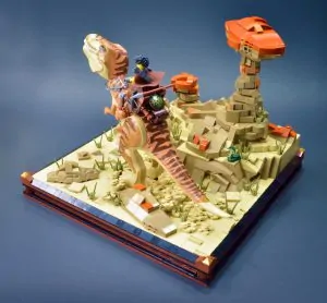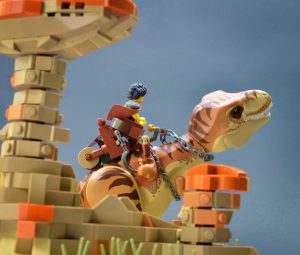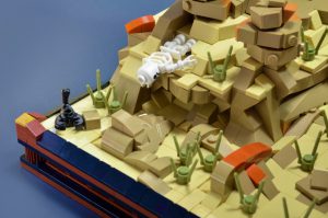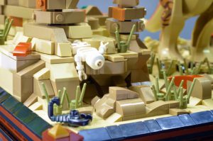 Jeg var spent på å se at en av tyrannosaurene som ble tilbudt i år inkluderte en ny fargekombinasjon. Denne nye malingsjobben er ikke bare mye mer behagelig (i hvert fall for meg) enn tidligere, men lar den også settes inn i en annen kontekst. Jeg har bygget mange MOC-er med mørkeblågrå steiner, men dette er første gang jeg har fokusert på mørk brunfarge og mørk oransje. Kombinert med den brunbrune sanden synes jeg dette gir et slående utseende, og en som skiller seg fra resten av byggene i denne serien. Ørkensteinformasjoner er veldig forskjellige fra de som finnes i andre miljøer, og det tok noen forsøk for å finne en teknikk som tillot meg å gjøre subtile endringer i størrelse og form i denne skalaen. Til slutt kom ostebakker og travis-klosser meg til unnsetning.