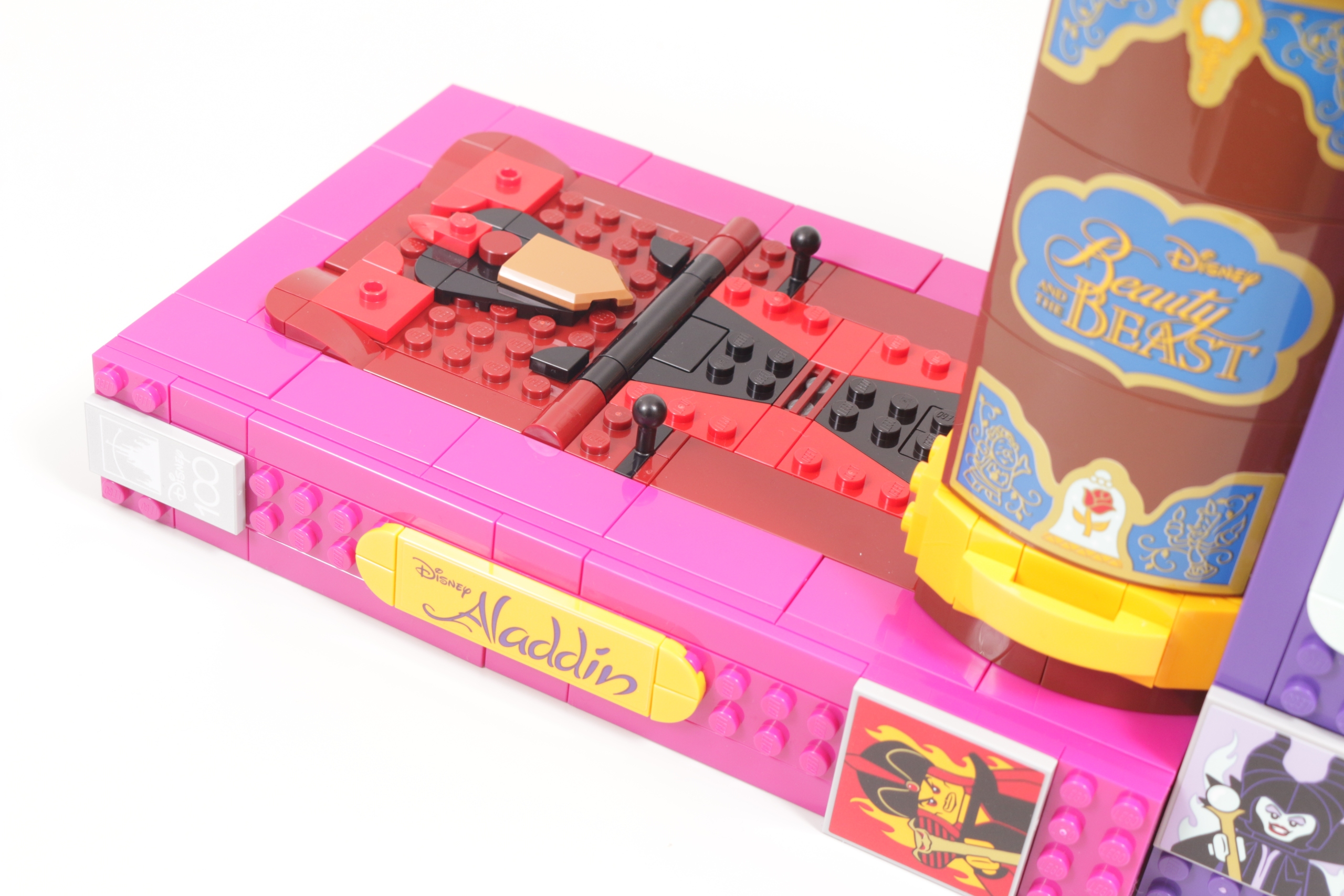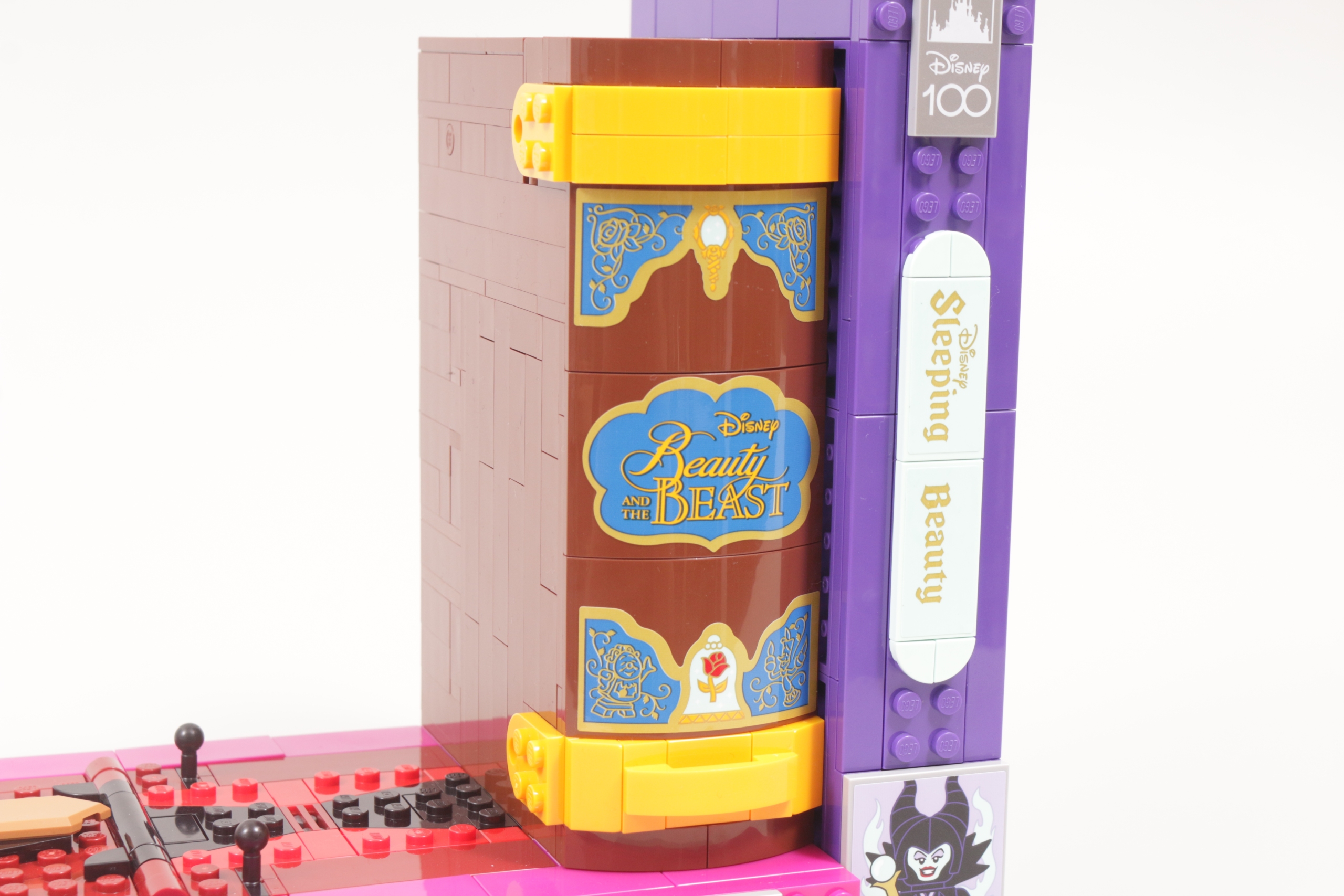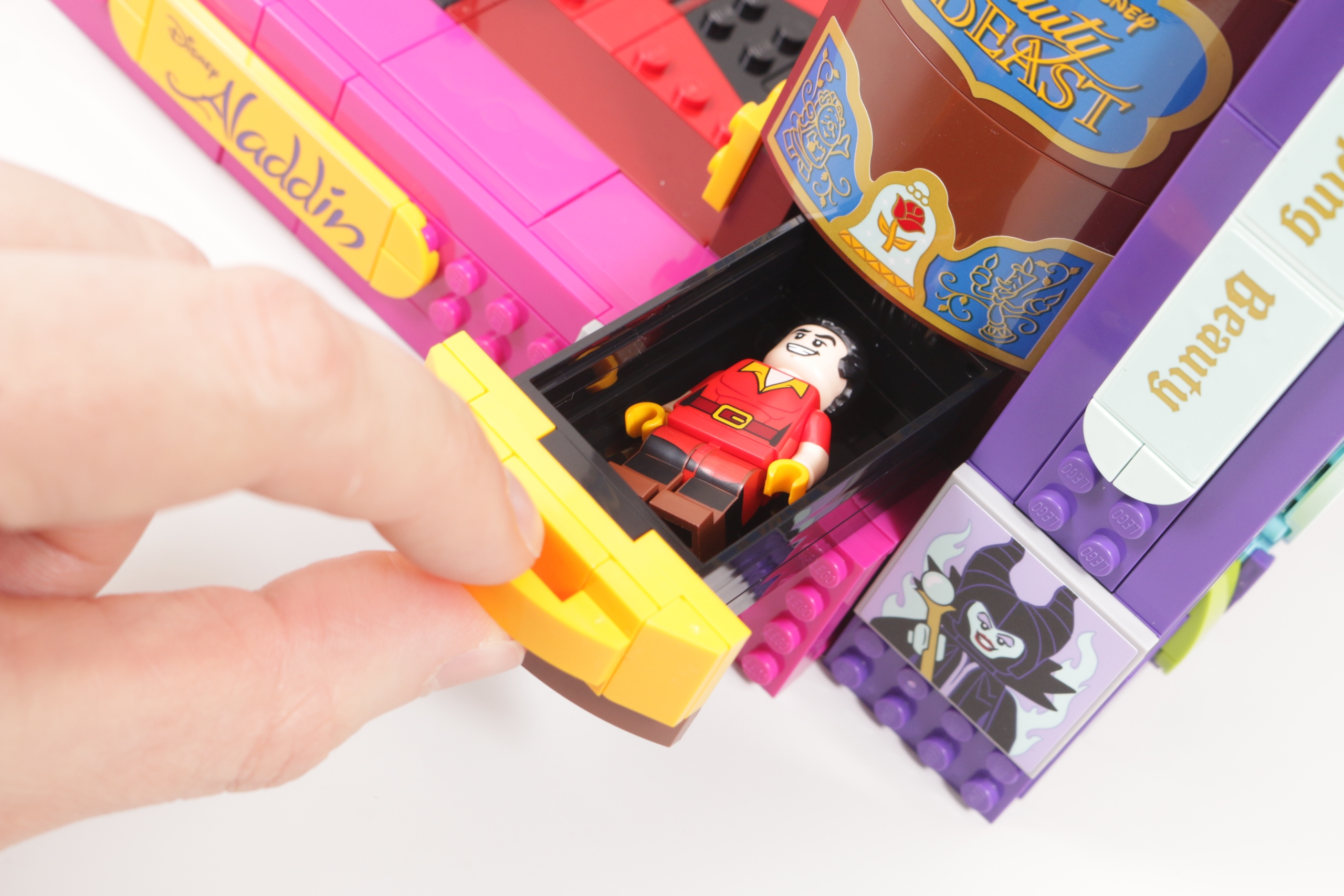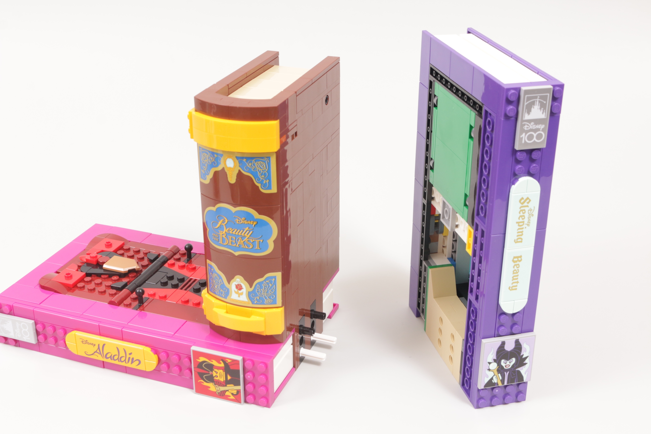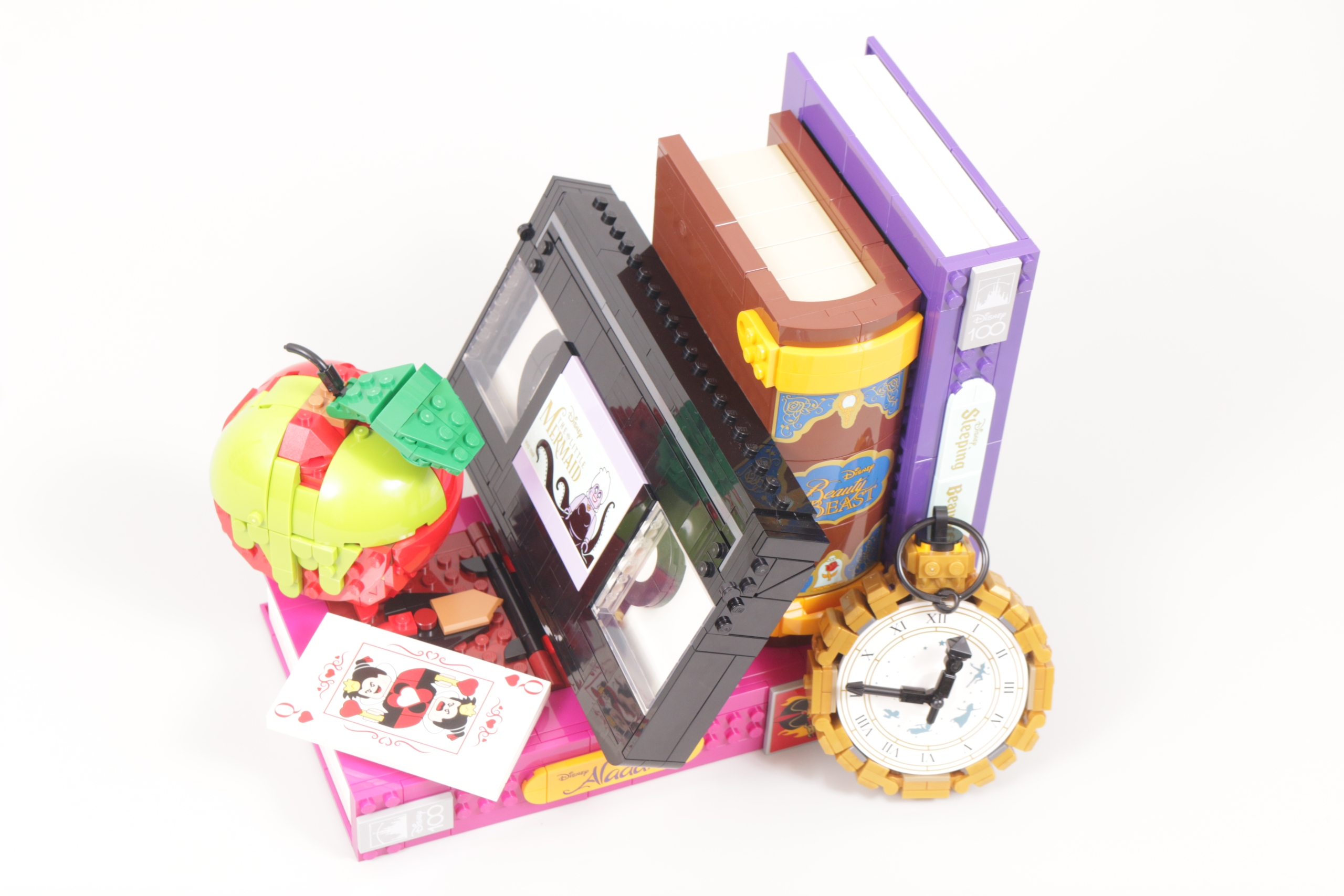 Det som ser ut som et gifteple i 1:1-skala løftet rett ut av Snøhvit (ikke bit i det...) har gjemt seg inne i den onde dronningen i forkledningen hennes, mens den vipper ned den øverste enden av VHS-båndet (som virkelig gjør det ser ut som en VHS-kassett for de av dere som er gamle nok til å vite hvordan en så ut) avslører en sekvens av LEGO-baserte filmrullebilder fra Den lille havfruen. I mellomtiden inneholder Skjønnheten og udyret-boken ikke bare et lite hull for Gaston å passe inn i, men også en flip-up mikro-konstruksjon av den innkapslede rosen fra historien, mens både Tornerose- og Aladdin VHS-dekselet er utmerket tema i design til filmene deres og hovedskurkene, og begge inneholder små områder som også huser respektive minifigurer.