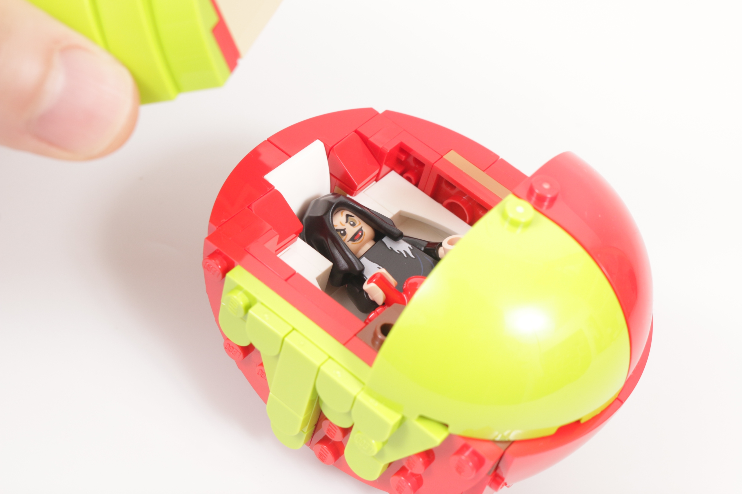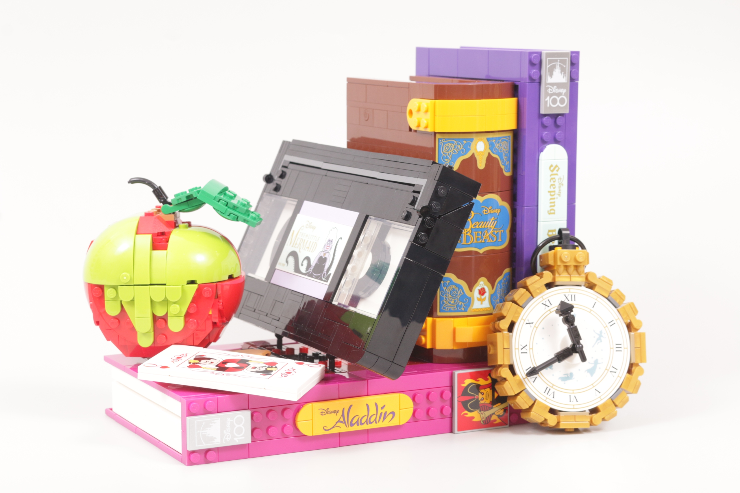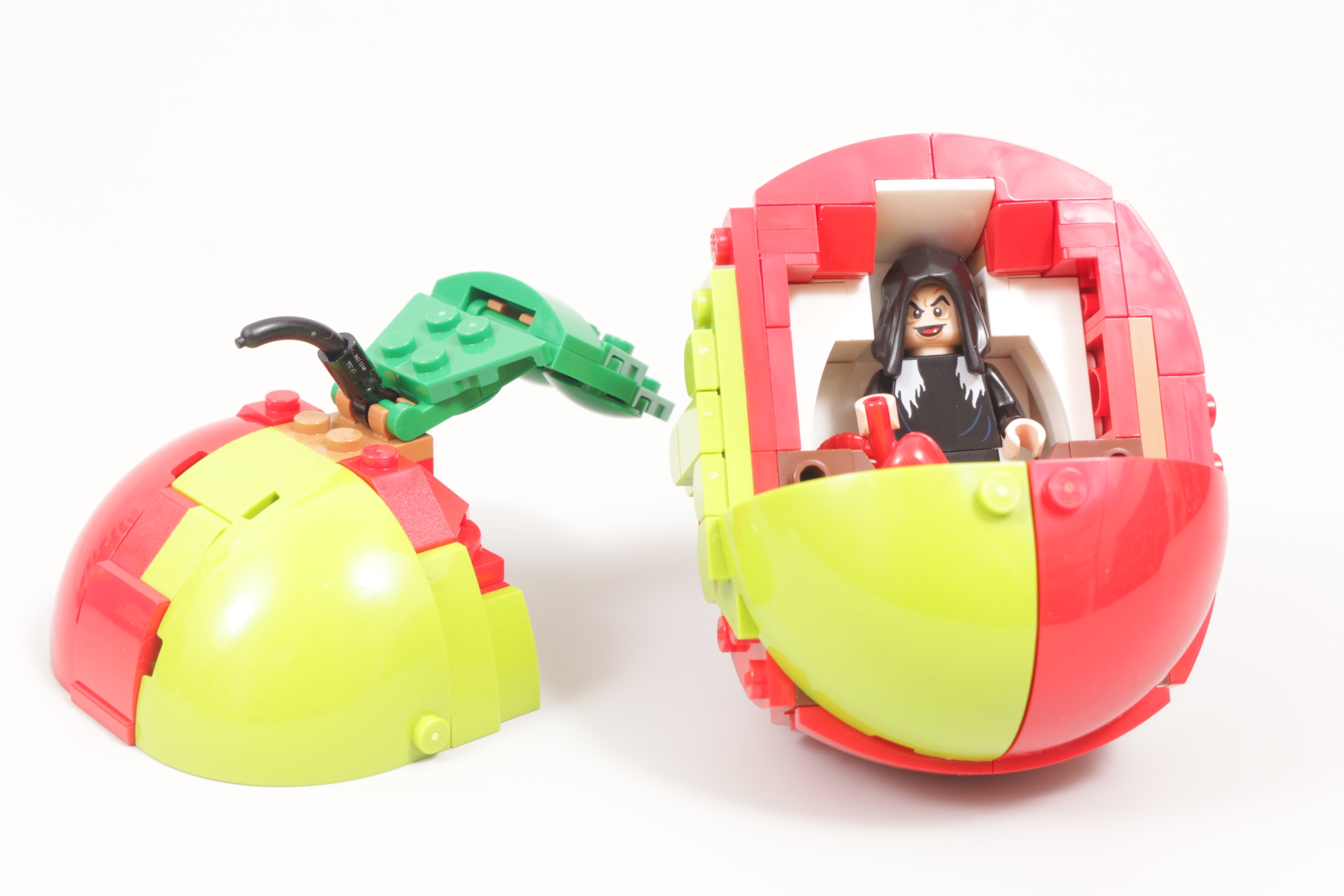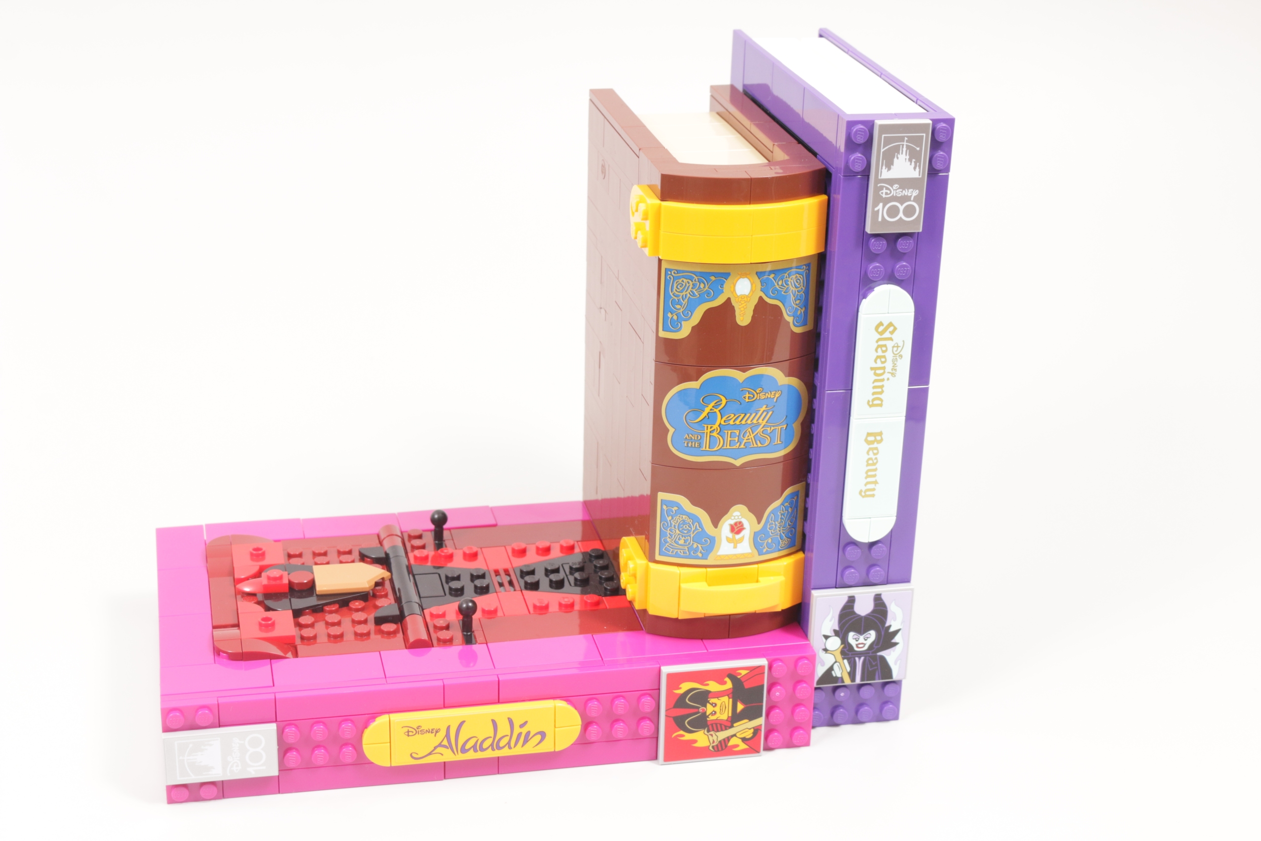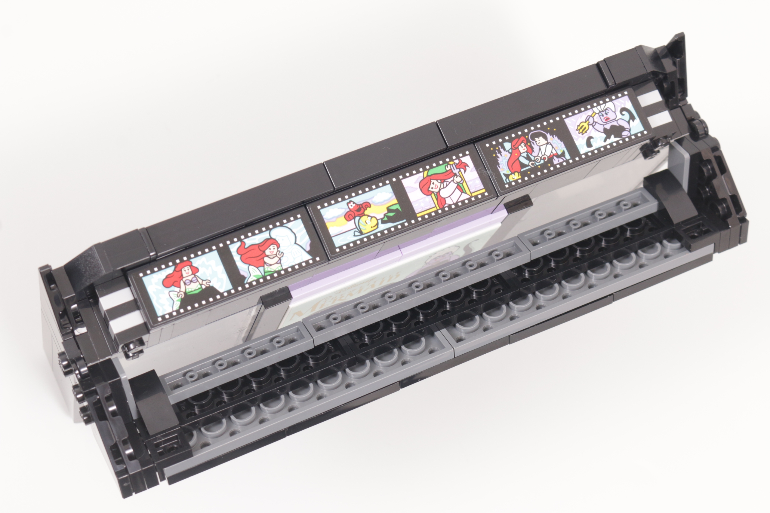 Det som ser ut som et gifteple i 1:1-skala løftet rett ut av Snøhvit (ikke bit i det...) har gjemt seg inne i den onde dronningen i forkledningen hennes, mens den vipper ned den øverste enden av VHS-båndet (som virkelig gjør det ser ut som en VHS-kassett for de av dere som er gamle nok til å vite hvordan en så ut) avslører en sekvens av LEGO-baserte filmrullebilder fra Den lille havfruen. I mellomtiden inneholder Skjønnheten og udyret-boken ikke bare et lite hull for Gaston å passe inn i, men også en flip-up mikro-konstruksjon av den innkapslede rosen fra historien, mens både Tornerose- og Aladdin VHS-dekselet er utmerket tema i design til filmene deres og hovedskurkene, og begge inneholder små områder som også huser respektive minifigurer.