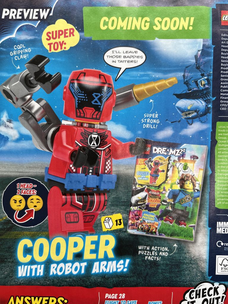 We nylig rapportert at neste måneds LEGO DREAMZzz-magasin ville komme med en sjelden minifigur gratisgave i form av Cooper med robotarmer. Karakterens torso og ben har begge tidligere dukket opp i 71458 Krokodillebil og 71459 Stall of Dream Creatures, men hjelmelementet er for øyeblikket kun tilgjengelig i det tidligere settet.