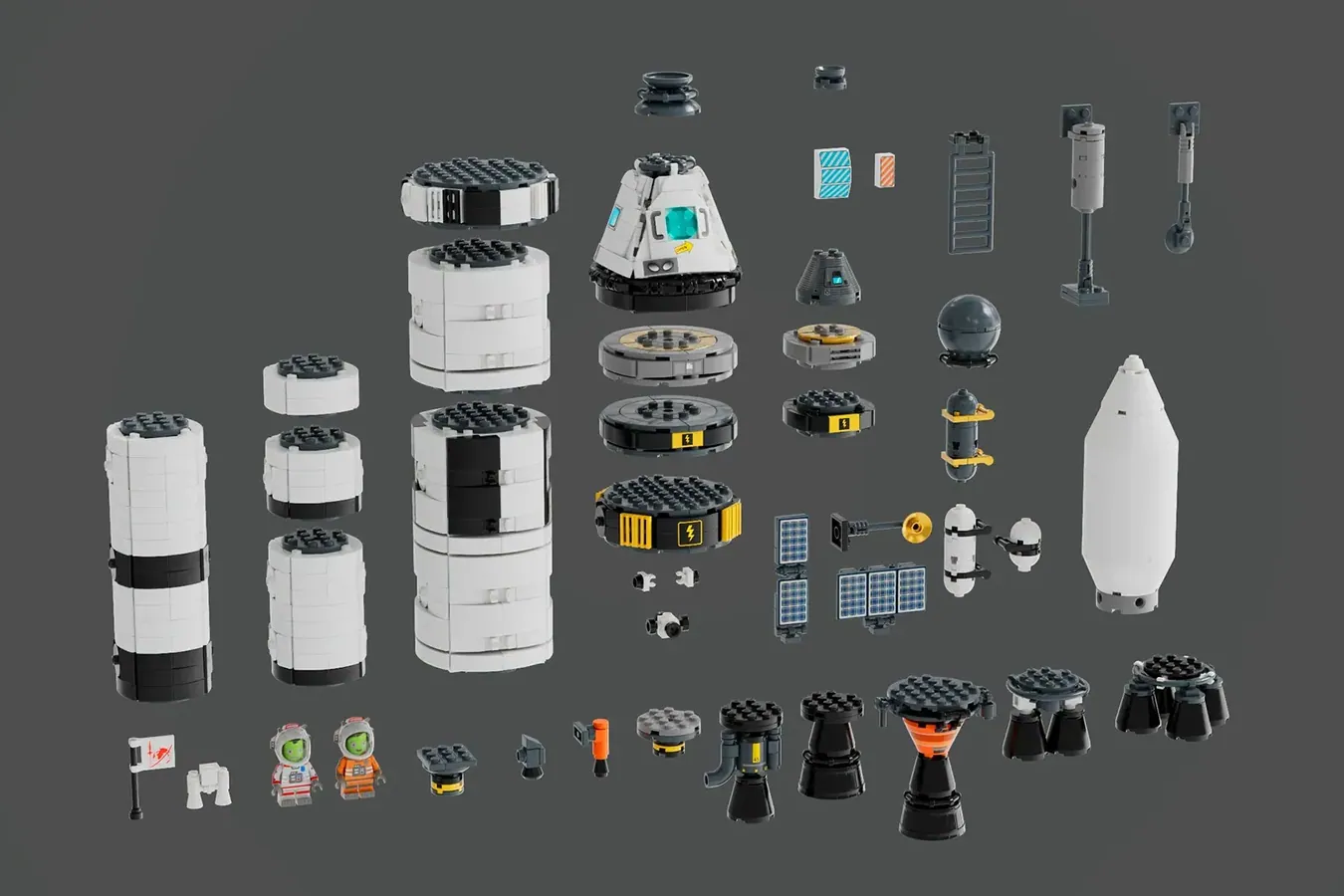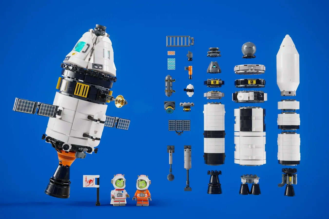 Imidlertid foreslår dette prosjektet nok brikker til å lage en av 40 kombinasjoner av romfartskjøretøy samt to Kerbal-minifigurer.