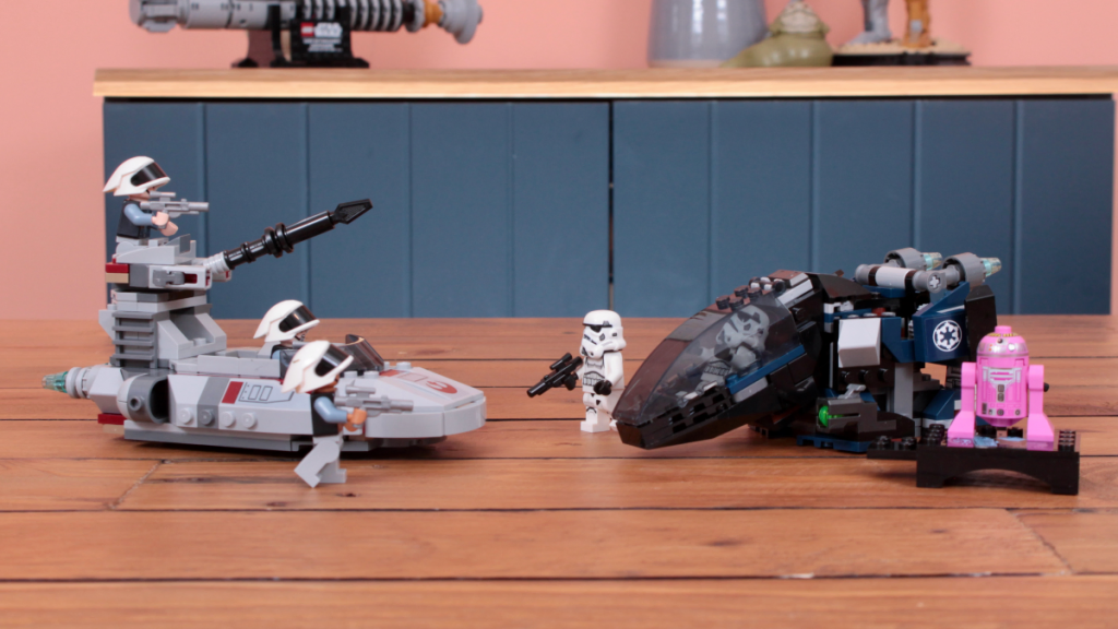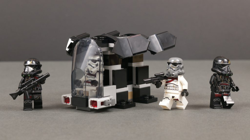 75431 er dobbelt så dyr, inkluderer litt mer enn dobbelt så mange deler – men ingen ekstra standard minifigurer. Og hva kjøper man en kamppakke for hvis ikke først og fremst minifigurene? Fjorårets 40755 Imperial Dropship vs. Rebell Scout Speeder tilbyr en annen relevant sammenligning, med samme pris i Storbritannia og EU (og 5 dollar billigere i USA, som vi sannsynligvis kan tilskrive tollsatser).
